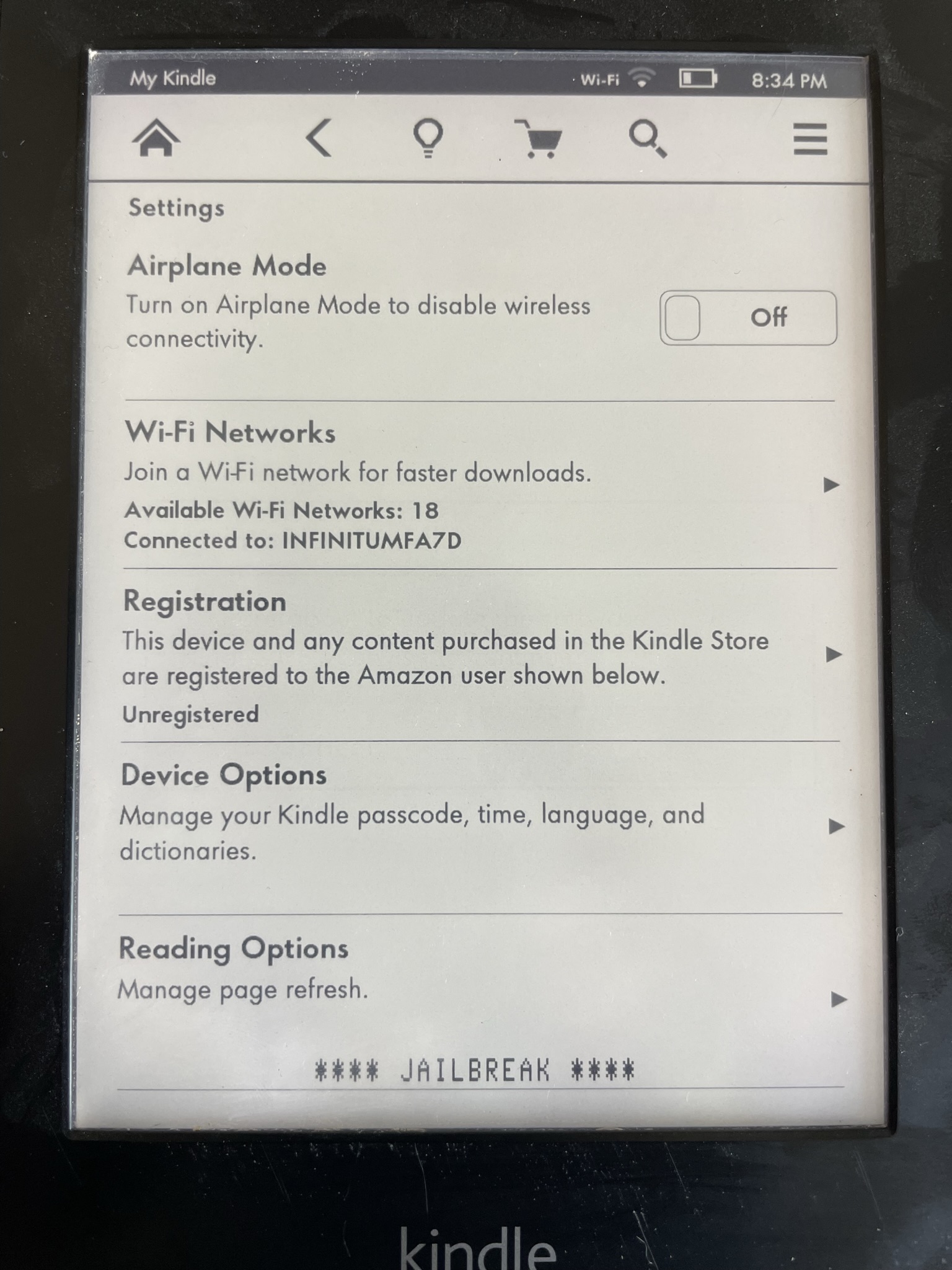 It's a PaperWhite WiFi 'PW' or 'KPW1', with serial number starting with B024. Initially I downgraded the firmware from v5.6.1 to v5.3.3 and then today upgraded it to v5.4.4 before applying the K5 JailBreak (5.0.x - 5.4.4.2) file kindle-jailbreak-1.16.N-r18869.tar.xz. The **** JAILBREAK **** text is then present at the bottom of the Settings page. Great! However, once I reconnect the USB cable to apply the hotfix, the JAILBREAK text disappears. Is the jailbreak still present if the text is missing? I've not seen this mentioned on the forum. I tried the jailbreak in Airplane mode as well as Wifi On with the same outcome. Thank you! |