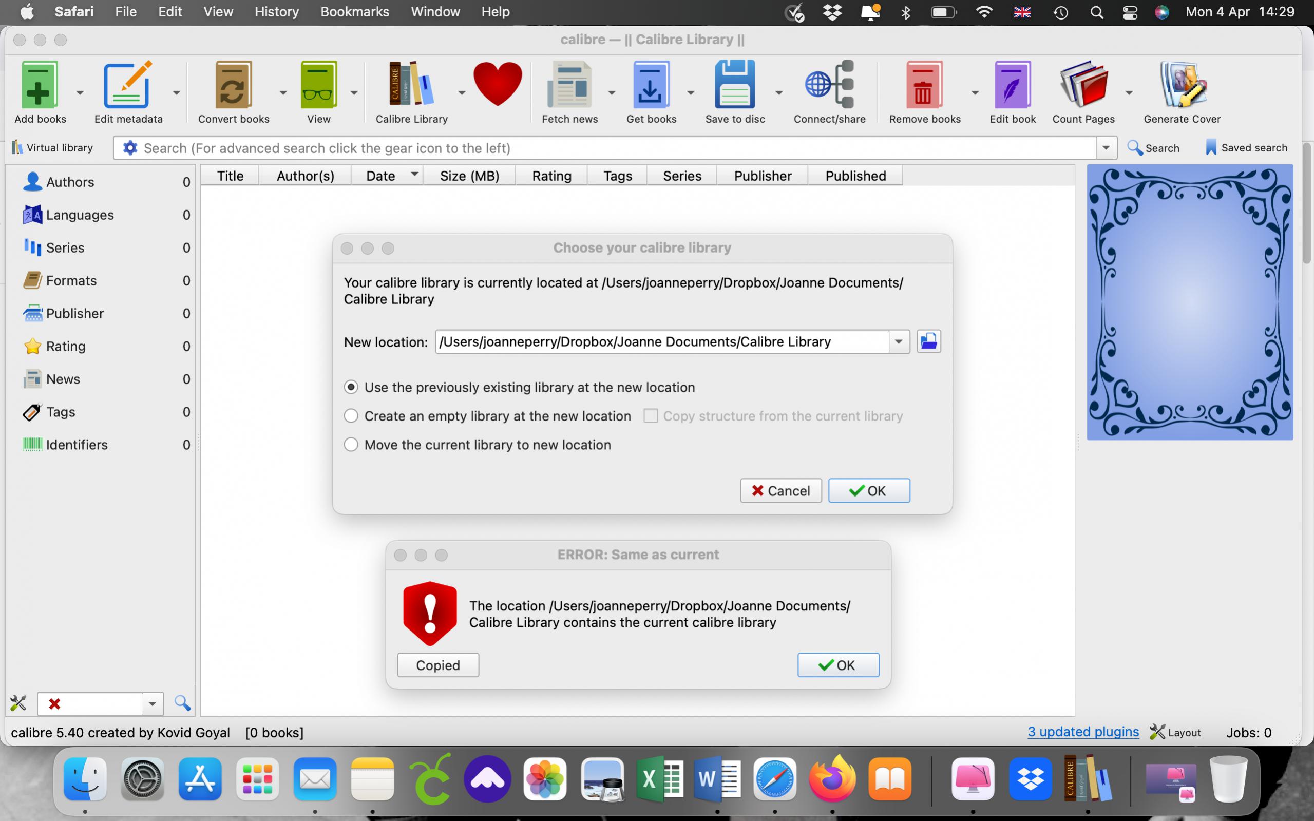 calibre, version 5.40.0 ERROR: Same as current: The location /Users/joanneperry/Dropbox/Joanne Documents/Calibre Library contains the current calibre library I don’t want to risk moving the calibre folder to a new location as that might break the link to my windows 10 pc. I just don’t understand why both my Mac and windows 11 show an empty database when they are pointing to the correct location which has over 8000 books in it. Last edited by Josieb1; 04-04-2022 at 12:07 PM. |