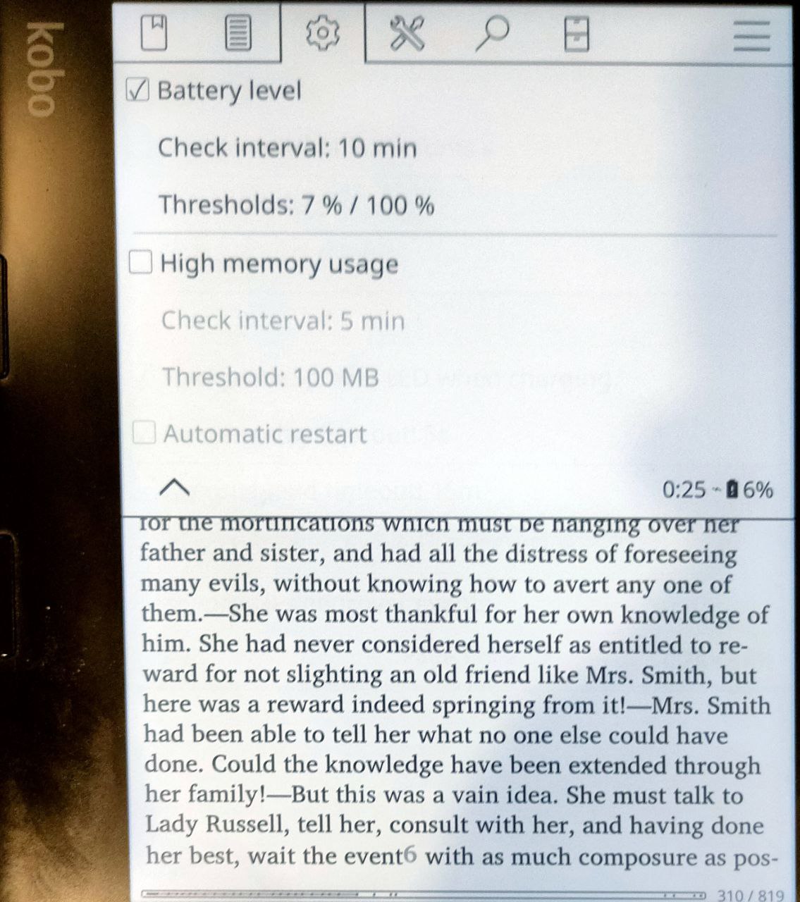 Having just received my first-ever second reader (an ex-demo Libra H2O), I set my Sage as shown in the screenshot attached. I wanted to be able to read to "almost empty" before switching to my backup device. When I checked for updates, I saw that it was 9%, and after that, my eyes remained glued to the device, eager to see what form the alter took. NO alert was given. What have I done wrong?