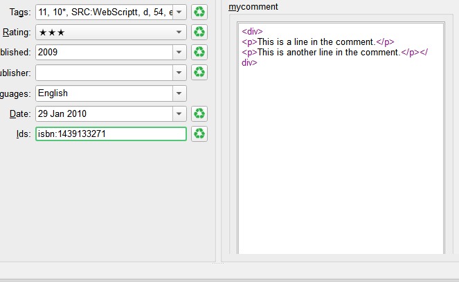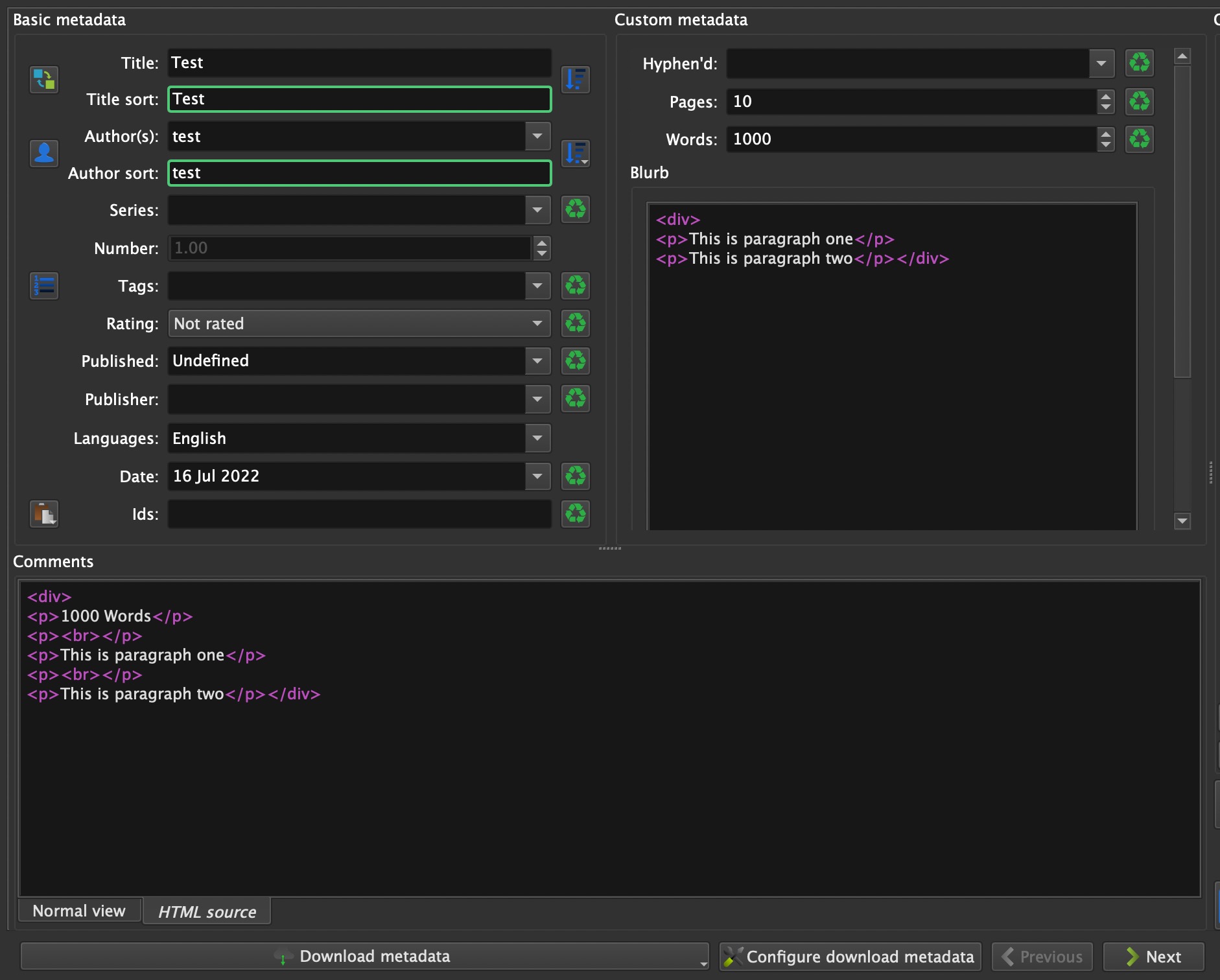 15. We see that using <div> causes calibre to add <p>. For fun, try it using <p></p> around the word count instead of div. Without showing the intermediate results, we get in edit metadata: