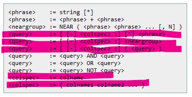 Thanks Kovid. I did use the reference in the FT window to the SQLite FTS5 syntax, which suggested more was possible, but I understand now that searching is limited to: