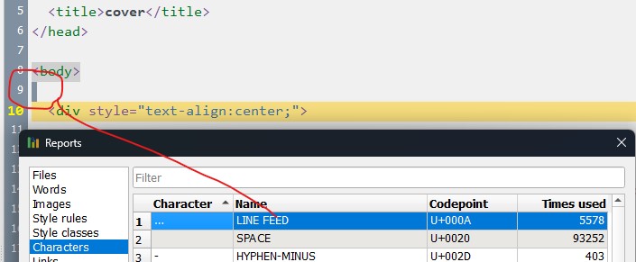 I do not use the edit-tool "Reports" that often, but today I noticed (see attachment) that with TAB "Characters" the "ellipsis" was displayed for "Line Feed", so there appears to be 2 kind of ellipsis's present. Is there a reason for not using the real "line feed" character (for instance as pictured right)? |