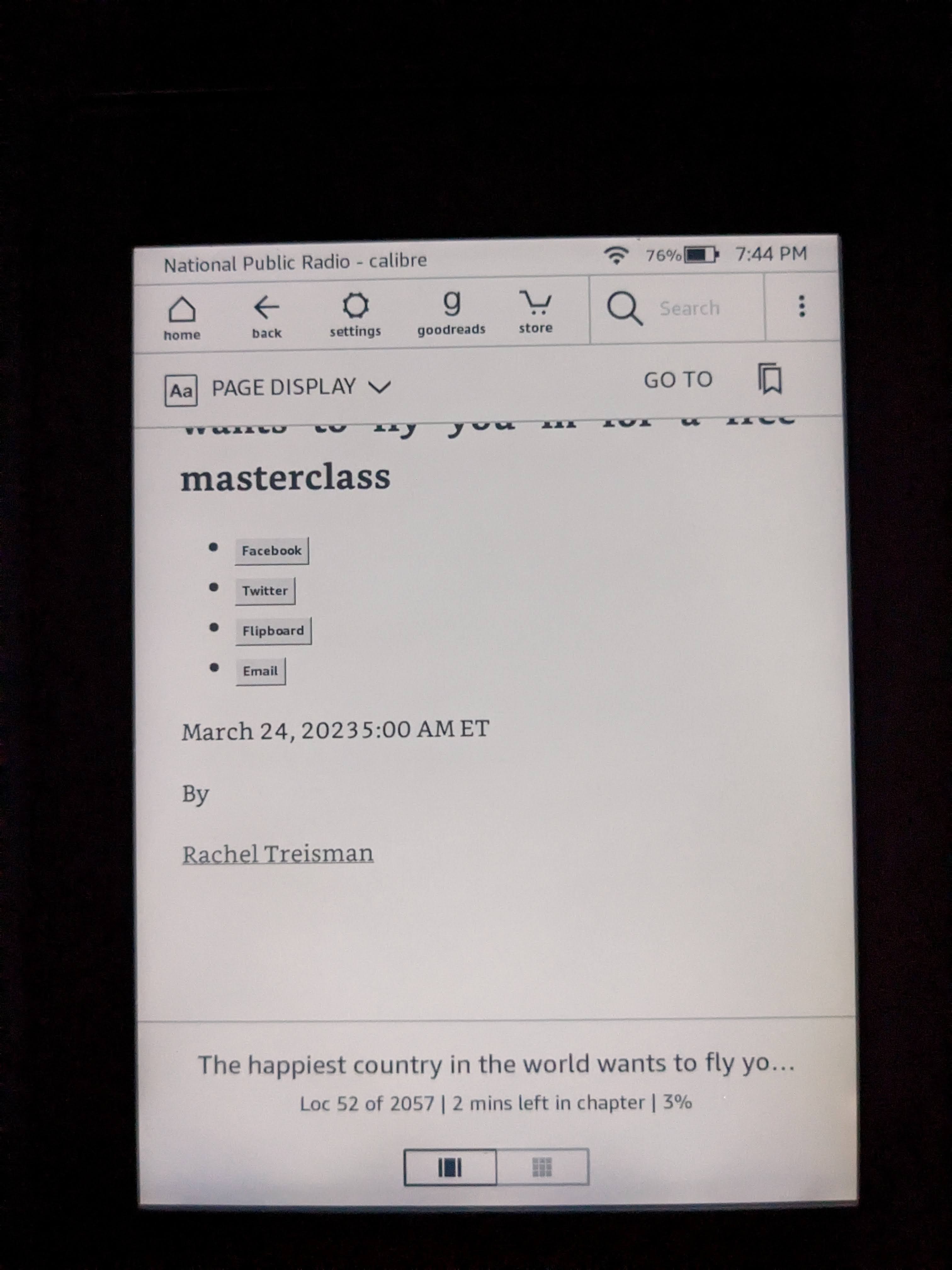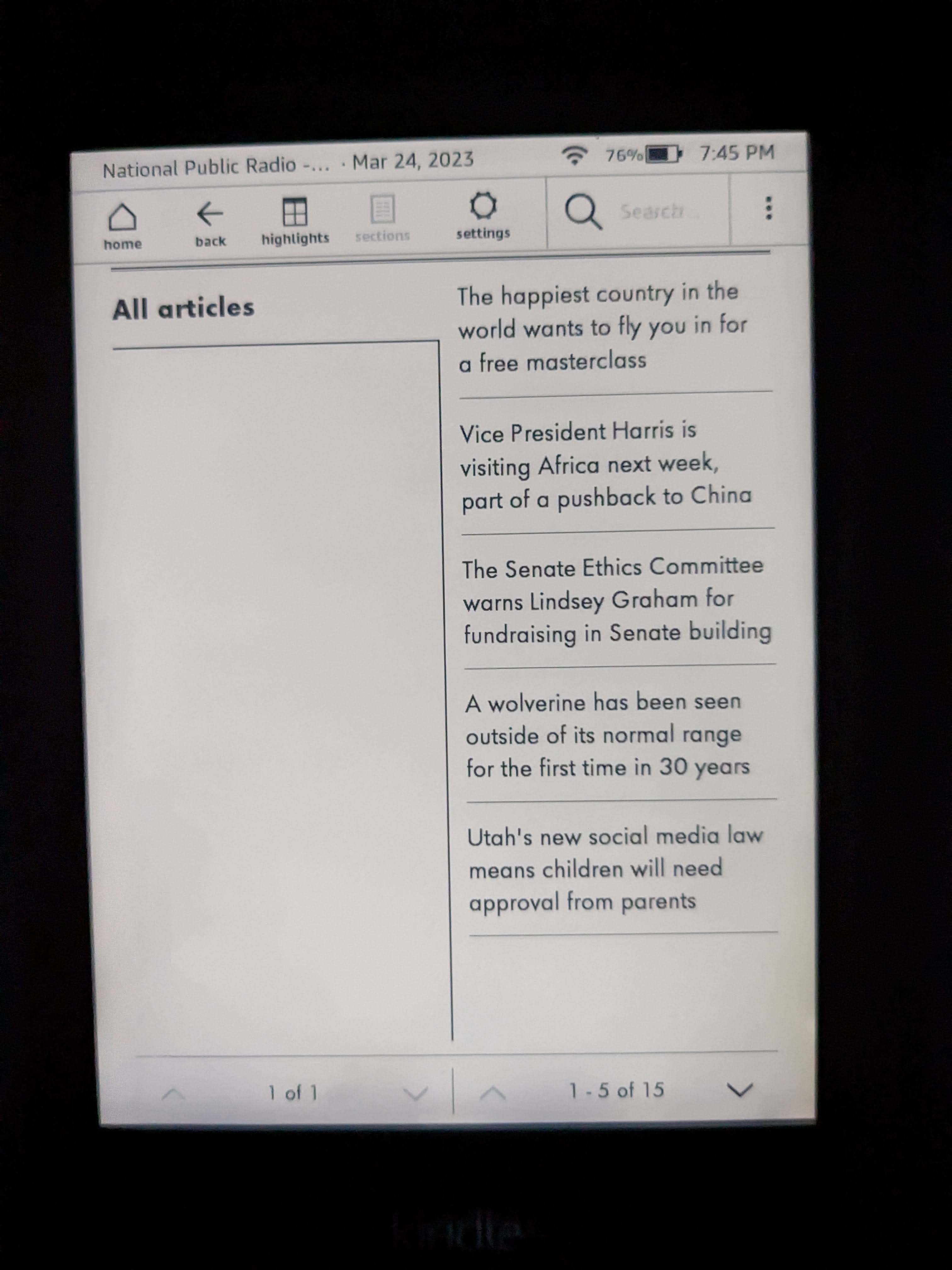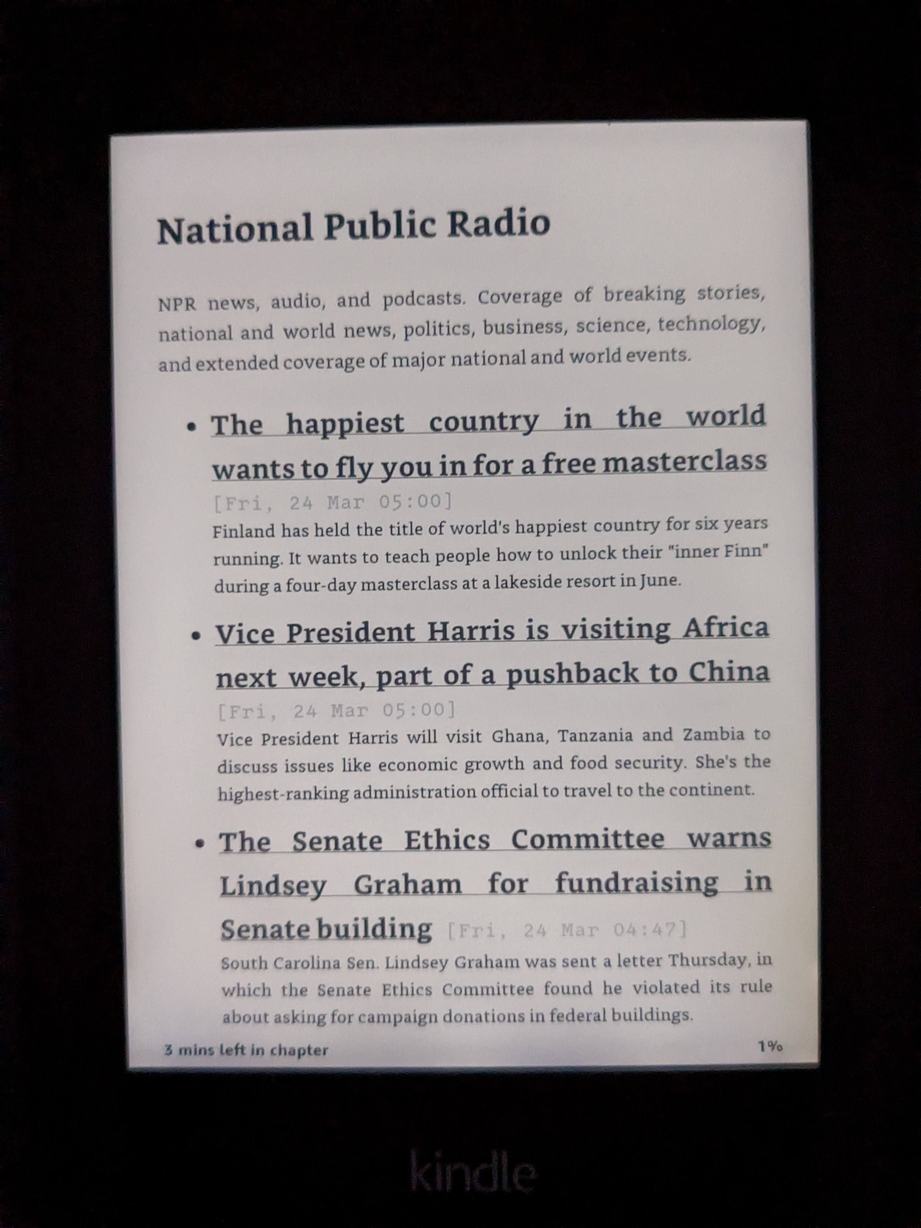 My issue is that the EPUB formatting is a lot harder to navigate and read than MOBI, and often includes web elements and links. News in MOBI format is always cleanly laid out and categorized. (Photos of MOBI vs EPUB formatting on my KPW attached.) Is there any way to make EPUB match the formatting of MOBI? Thanks! |