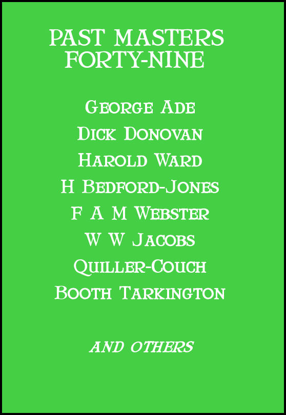 An anthology containing seventeen short stories in the Life + 70 Public Domain, collected from various magazines: 1: Loafer's Lullaby / George Ade 2: A Night of Horror / Dick Donovan 3: A Dying Confession / Dick Donovan 4: The House in the Forest / Harold Ward 5: House of the Living Dead / Harold Ward 6: From the Dark / H Bedford-Jones 7: Breakfast at the Savoy / H Bedford-Jones 8: The Double Problem / F. A. M. Webster 9: According to Law•/ F. A. M. Webster 10: In Borrowed Plumes / W. W. Jacobs 11: Ye Ghoste of ye Olde Bowerie Roade / Percie W. Hart 12: The Last Letters of a Hoofer / Jack Donahue 13: The Lady of the Red Admirals / Arthur T. Quiller-Couch 14: Mutiny on the Inchcliffe Castle / Guy Gilpatric 15: The Siamese Cat / Raoul Whitfield 16: The Captain's Chronometer / James M'Govan 17: The Old Red Barn / Booth Tarkington Cumulative Index to No 49 This work is assumed to be in the Life+70 public domain OR the copyright holder has given specific permission for distribution. Copyright laws differ throughout the world, and it may still be under copyright in some countries. Before downloading, please check your country's copyright laws. If the book is under copyright in your country, do not download or redistribute this work.