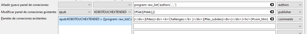 Second, thank you so much for the suggestion, Terisa. It took a little finagling but I finally got it to work. Based on what I saw in your configuration I was able to get the info I wanted to show up but it was overwriting the actual synopsis on the Kobo. By putting in the following I was able to get everything I wanted to show up. Code: