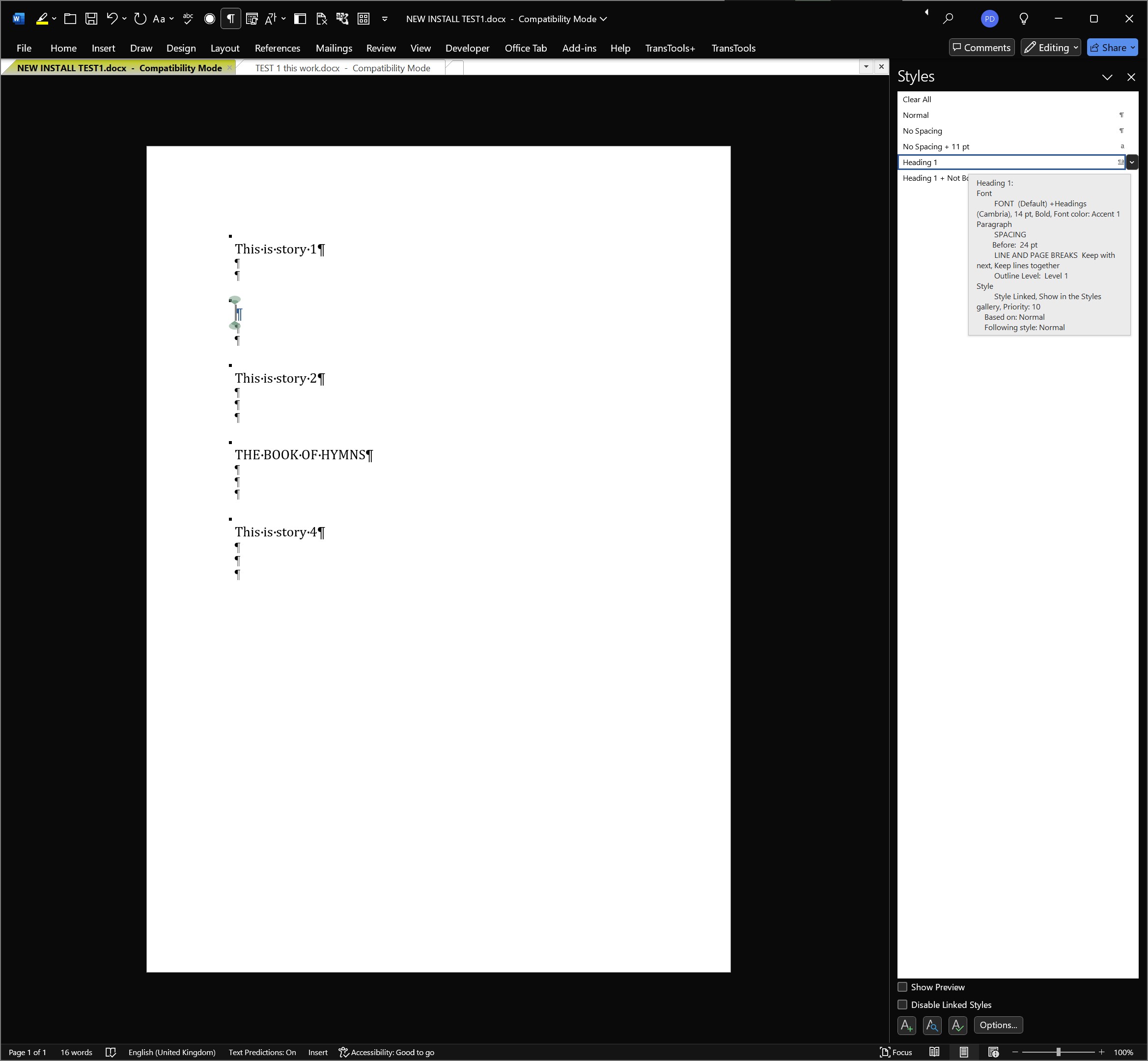 I am having issues with page breaks at parts of the book where there are no page breaks. Attached is the test word file with the actual title. I have reinstalled word, reinstall calibre, reset the word template. and a load of other things to fix this issue. There are no visable page breaks in the document yet they still show in the converted epub file ! The page break shows before the title "The book of hymns" yet it is not in the word file. I have not changed any configs in word or calibre. Can anyone tell me why this might be happening. TIA |