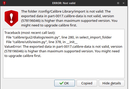 Could this be Exporting from a Newer version of Calibre and attempting to import an a older version (trapped by old HW)?