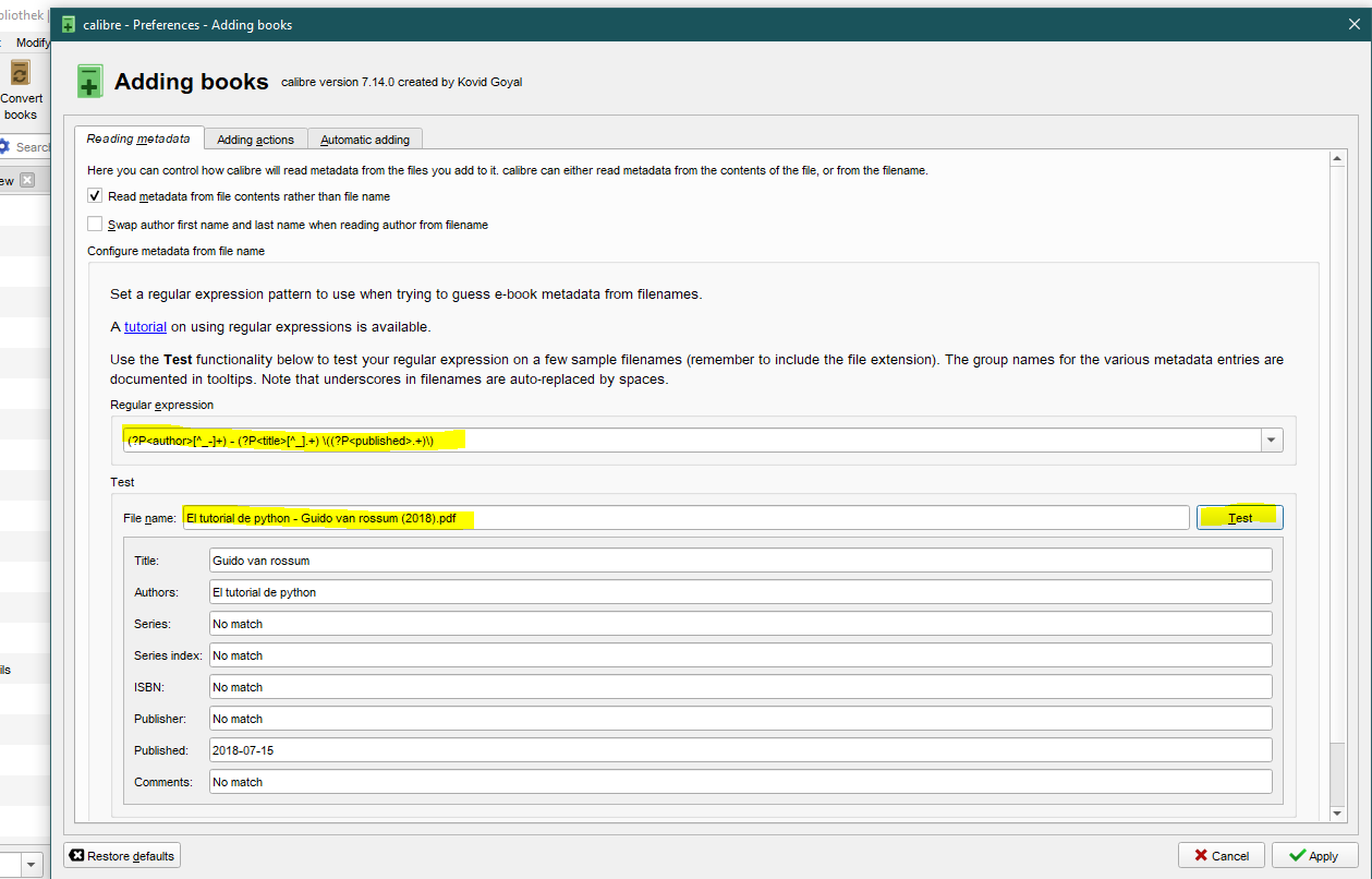 During the last years, I've been storing all my books using this simple format: El tutorial de python - Guido van rossum (2017).pdf Zed A. Shaw - Learn Python The Hard Way (2011).epub I'm lookinf for a regex template to be able to capture the metadata correctly. I've tried multiple kind of combinations, but I'm not being able to capture the year. One of the last examples I tried: (?P<author>[^_-]+) - (?P<title>[^_].+) (?P<published>[^_]).+? No matter the way I trie.. i never get the year. Could yopu please help me with this? Thanks in advance! |