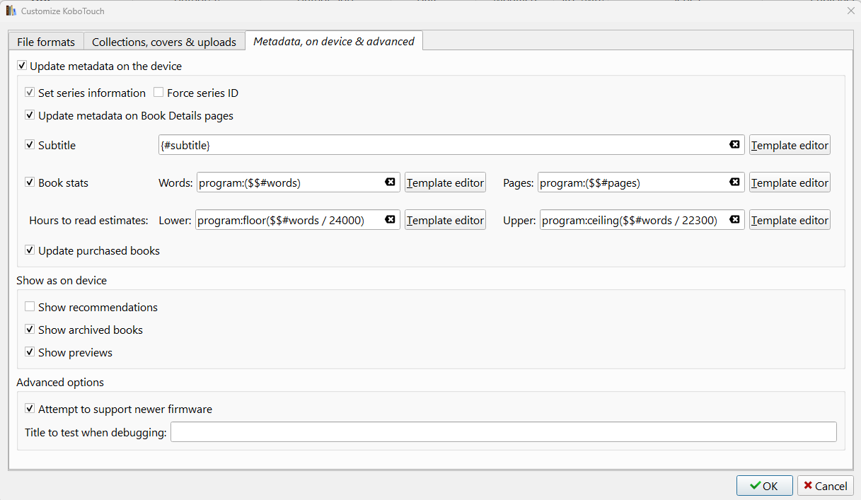 I've attached some images of how I have configured the KoboTouch driver. Any items you are wondering about, just ask. |