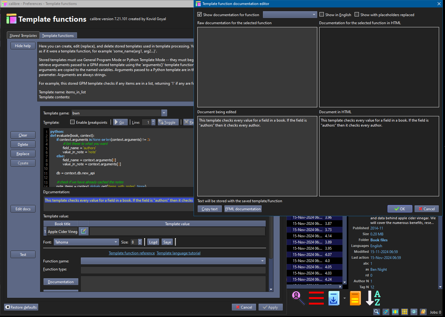 ![]() The documentation on the web won't be updated until the next calibre release (not preview). Translators and documentation editors: The documentation uses an invented markup language "Formatter Function Markup Language" (FFML), a subset of BBCODE (used by MobileRead) and RST (sphinx web documentation). Both HTML and RST can be generated from FFML. It is documented in the FFML processing code (calibre.utils.ffml_processor.py), and inside calibre by pushing the (new) "General Information" button in the template tester. A simple editor/viewer is available in calibre for documentation either while editing or translating. There is no requirement to use it, but doing so might help avoid formatting errors. This viewer/editor is available in two ways: