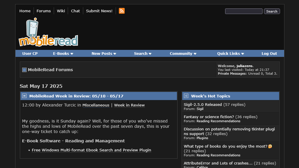 Features: ––––––––––––––––– - Many site fixes, adjustments etc. - Mobile-friendly mobileread.com (only userscript install method) - Dark theme of course. - Should work on any mobile or pc browser that supports userscripts. How to install? ––––––––––––––––– Using Stylus extension (no mobile-friendly) 1. Install Stylus addon: Firefox, Chrome. 2. Open https://userstyles.world/style/13484 3. Click Install. Using userscript manager (+ mobile friendly site!): 1. Install Userscript Manager 2. Open https://greasyfork.org/scripts/520704 3. Click install. Last edited by juliazero; 06-14-2025 at 11:16 AM. |