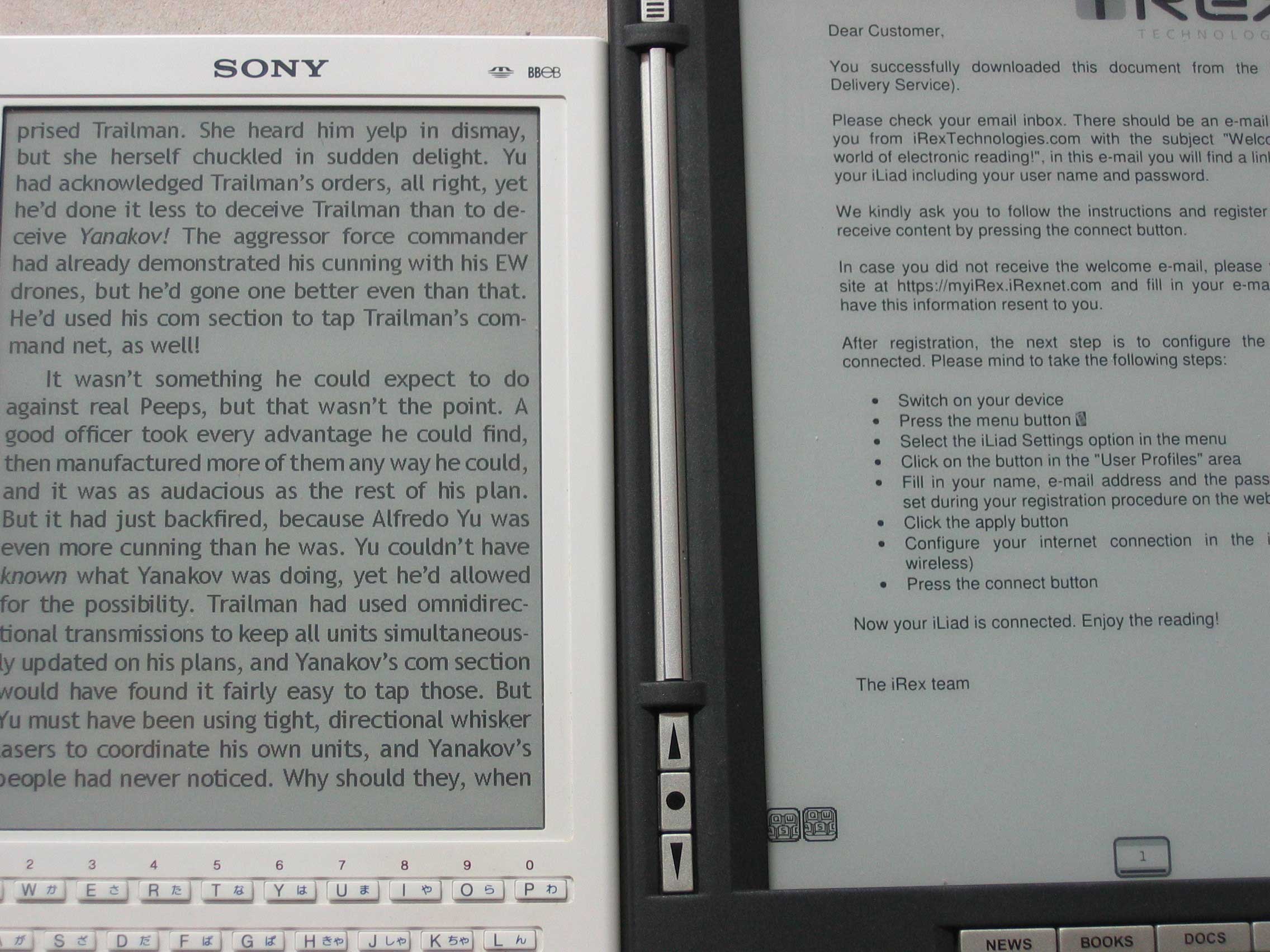 ![]() Interesting that 3rd pic shows the Sony Libre having a lighter or brighter background than the iLiad while the others all the reverse. Contrast on the Libre looks good enough for me. Any chance we can get more pics of the Libre? |