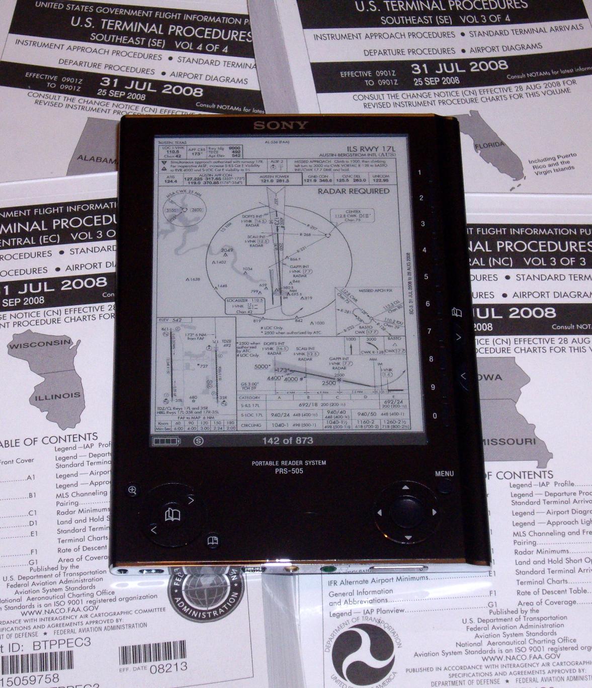 I've been working on AFD and Approach Plates for my PRS-505. Mostly so I don't need to carry a paper AFD, and as a backup for my tablet which contains my 'real' approach plates.
