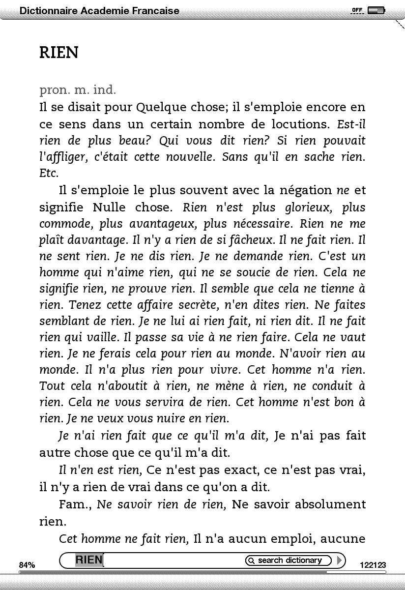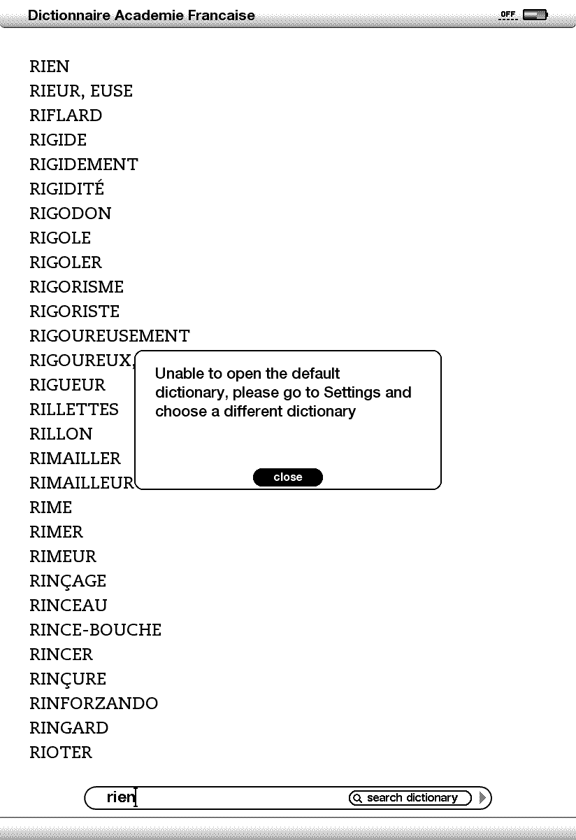 I've created a Romanian dictionary (I want to upload it here also, but first to be sure it is OK), which is working fine, but only if in Mobipocket Creator I set the input and output languages as English. Weird. Working fine means I don't get an error "Unable to open the default dictionary, please go to Settings and choose a different dictionary" when performing a search. I told myself it's my fault, well, I don't know how to build a dictionary. So I downloaded a free French dictionary, and, while reading a French book, if I type a word and click Dictionary (after using the 5-way button going right a few times) I get the same error message. Both were .PRC files from internet, I didn't touch them, but still I get the same error, so something else is going on. If somebody else has some experience with foreign dictionaries, is this normal? Kindle DX doesn't like dictionaries set in foreign languages? I'm attaching some pictures, maybe it's more clear this way. First capture is the French book, the second is when I type a search-term, then I choose Dictionary and I get the error explaind (but the dictionary is there, in the background). If I click Close and after select the Dictionary button I get the looked for page. But why the error? Thank you for your ideas debugging this. Best regards |