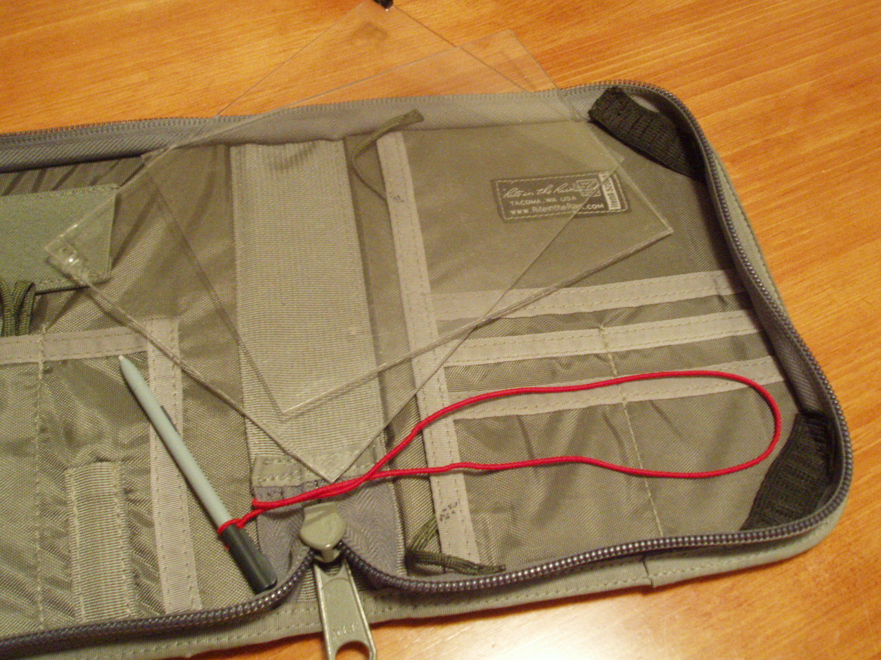 After weeks of fiddling around, I've finished my little project of making a suitable cover for my DR800. Neither the luxury cover nor the M-Edge cover really please me. I chose my Rite-In-The-Rain planner, removing the ring binder, which slid out easily as it's not attached to the case. The case contains sheets of plastic sewn into the covers, but I reinforced them with sheets of Lexan (see second photo); fortunately both covers have pouches that can hold them. I took a length of elastic cord I'd gotten from a little gift box and used it for a tether for the stylus; again, fortunately the case has a pouch for a pen or something that is exactly the right size to hold the stylus, so all I had to do was stitch the cord to the case. I had wanted to take advantage of the mounting holes on the device to mount it to the cover, and you can see evidence of my attempt in the second photo, but in the end it proved easier to sew in a couple of pieces of elastic and a couple of short lengths of cord to hold the corners, and that works well enough. All told I spent about $15 on materials (I got the planner from supply).