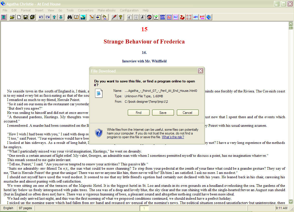 Now it was working perfectly till a couple of days back and i was able to open the lit formatted books, format them for the reader and transfer. For last 2 days(and i am pretty sure nothing has been installed on my laptop during that time) bookdesigner is not able to convert the books. In the middle of processing, a windows dialog pops up (see attachment) asking me to save the file(i am guessing the temporary file that bd makes in processing). Its not even working with the lit's i had converted earlier so its definitely something new. It works fine with txt and html formats even now. The only thing that could have changed is windows update might have downloaded some new fixes. any ideas on this? |