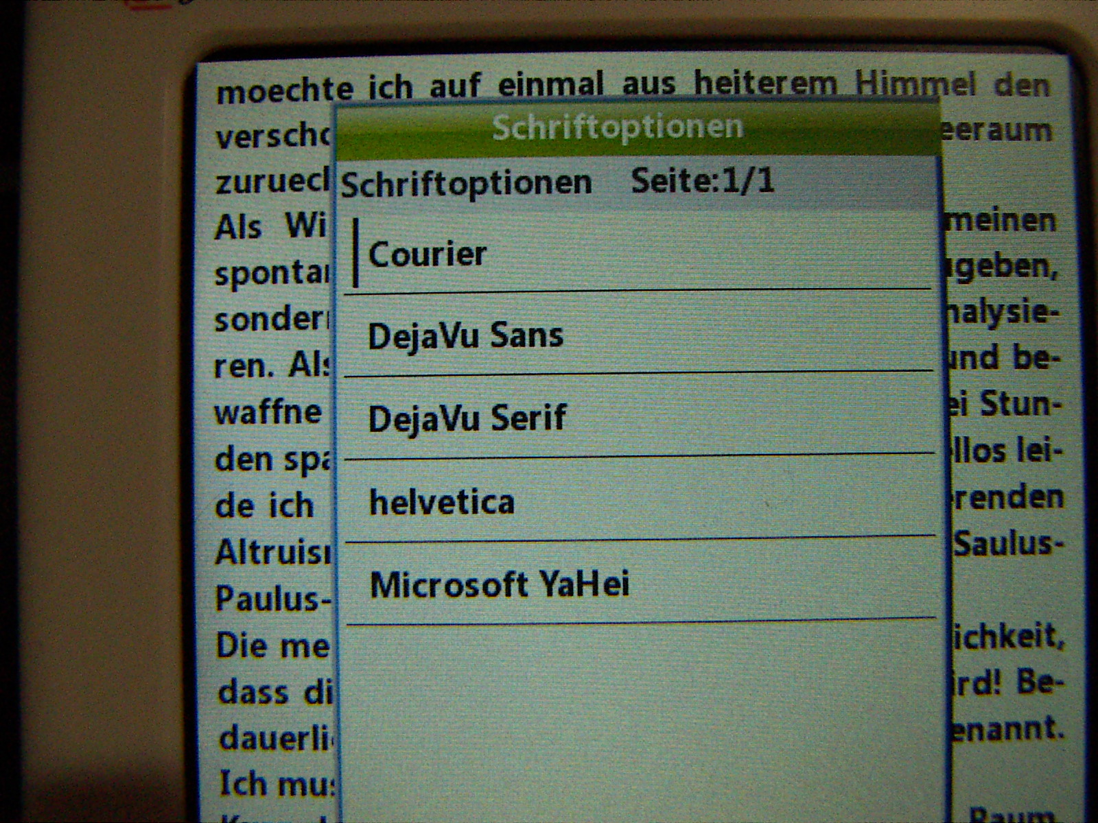 Mal kurz meine ersten Eindrücke zusammen gefasst: Das Display ist entspiegelt und gut ablesbar. Schrift wird scharf dargestellt. Grenzwertig (wie alle TFT's) natürlich in der Sonne. Dafür habe ich aber noch einen Hanvon N516. Das Gerät soll in meinem Fall aber das Abend/Nachtlesegerät sein. So wie es aussieht lässt sich das Display weit genug runterregeln, so das man ohne Sonnenbrille abends lesen kann. Genau werde ich es heute abend rausfinden. Die Grösse ist in meinem Fall ideal da ich meist auf der Seite liegend lese (zur Zeit noch mit einem PDA). Ein grösseres Gerät ist da eher unpraktisch. Man kann die Displayabschalt- und Standbyzeit getrennt voneinander einstellen. Ein Manko ist das man die Farben nicht einstellen kann. Lese im dunkeln am liebsten mit schwarz HG und hellgrüner Schrift. Schwarze Schrift auf Weiß ist aber vorgegeben Ich hoffe hier mal auf eine Firmwareupdate. (Das aktuelle Linux ist vom 27.7). Es sind 5 Schriftarten drauf( Courier, DejaVu sans/Serif,Helfetica, Microsoft Yahei). Werden auch alle gut dargestellt und halte ich für aussreichend. Die Schriftgrössen lassen sich in 6 Schritten verstellen(pt. 6,9,12,18,24,36). Die 15pt wäre für meinen Geschmack die ideale - (fehlt leider). Geht so aber auch. Man kann weiterhin Textausrichtung, Zeilenabstand und Ränder einstellen. Leider werden diese nicht gespeichert so das man das pro Buch machen muss. Voreingestellt ist Blocksatz und Microsoft Yahei 12pt. Umstellen auf Quer ist möglich. Epub und Prc werden gelesen. Mehr hab ich noch nicht ausprobiert. DRM-geschütze Bücher hab ich noch nicht. Soll aber wohl mit Adobe gehen. Darstellung ist flott und das ganze Handling ist angenehm schnell. Hab mal testweise ein Divx laufen lassen - hat gut funktioniert. Mp3 spielt er auch. Allerdings klappt da die automatische Abschaltung nicht. Für Hörbücher hätte ich das gerne gehabt (höre meist abends). Der eingebaute Lautsprecher ist ausreichend für Hörbücher. Die Dateinavigation klappt gut. Unterverzeichnisse sind kein Problem. Dabei ist ein Ladegerät mit einer Minihohlbuchse. Laden lässt er sich aber auch über die USB-Buchse. Weiterhin ein Kopfhörer, ein schönes Lederetui mit Magnetverschluss und ein USB-Kabel. Und natürlich eine deutsch Handbuch. Braucht man aber eigentlich nicht. Die eingebauten 2GB Speicher werden als Laufwerk unter Win angezeigt. Ebenso die MicroSD-Card. Meine 4GB-Karte wurde problemlos erkannt. Das Gerät wirkt sauber verarbeitet. Der Preis ist auf alle Fälle angemessen. Verarbeitung ist mit meinem Hanvon vergleichbar. Die Unzulänglichkeiten sind meiner Meinung nach mit einem Firmwareupdate behebbar. Hab noch ein paar Bilder anghängt. Grüsse Pl |