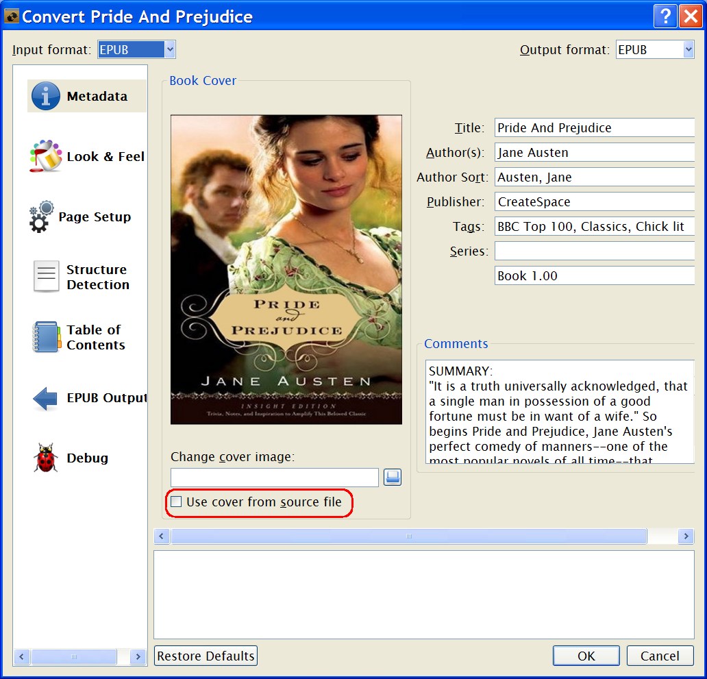 However if you previously had checked Use cover from source file then the conversion will keep using the cover from the source file (see attached). I always leave this unchecked and I always have calibre use the cover I put in the calibre library. Also ensure you don't have No default cover checked under epub output(see attached). Last edited by DoctorOhh; 12-21-2010 at 01:12 AM. |