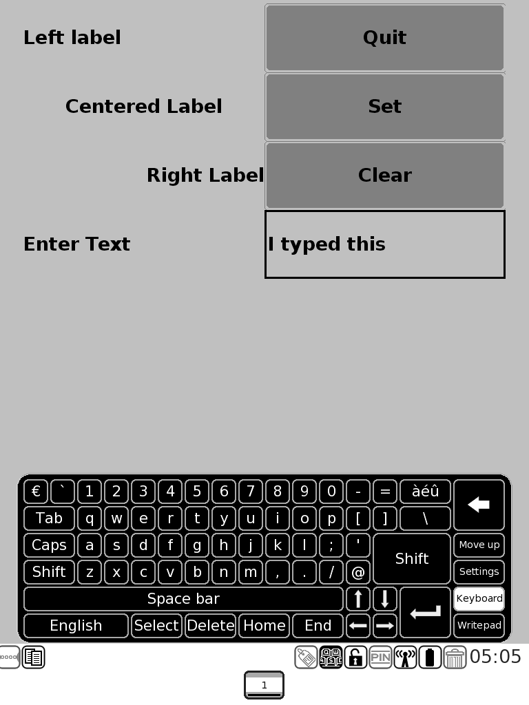 Thanks! TextField is now very close to being releasable, still needs a couple mundane things done to it: respect editable, respect max chars, grok backspace... ![]() But I can now enter text! I've also written my own classes for controlling the e-Ink refreshes (Quick and Full) and for the Tool Bar. The test case has been upgraded to use them. I think my API's are more approachable than iRex's lightly ported C API's. |