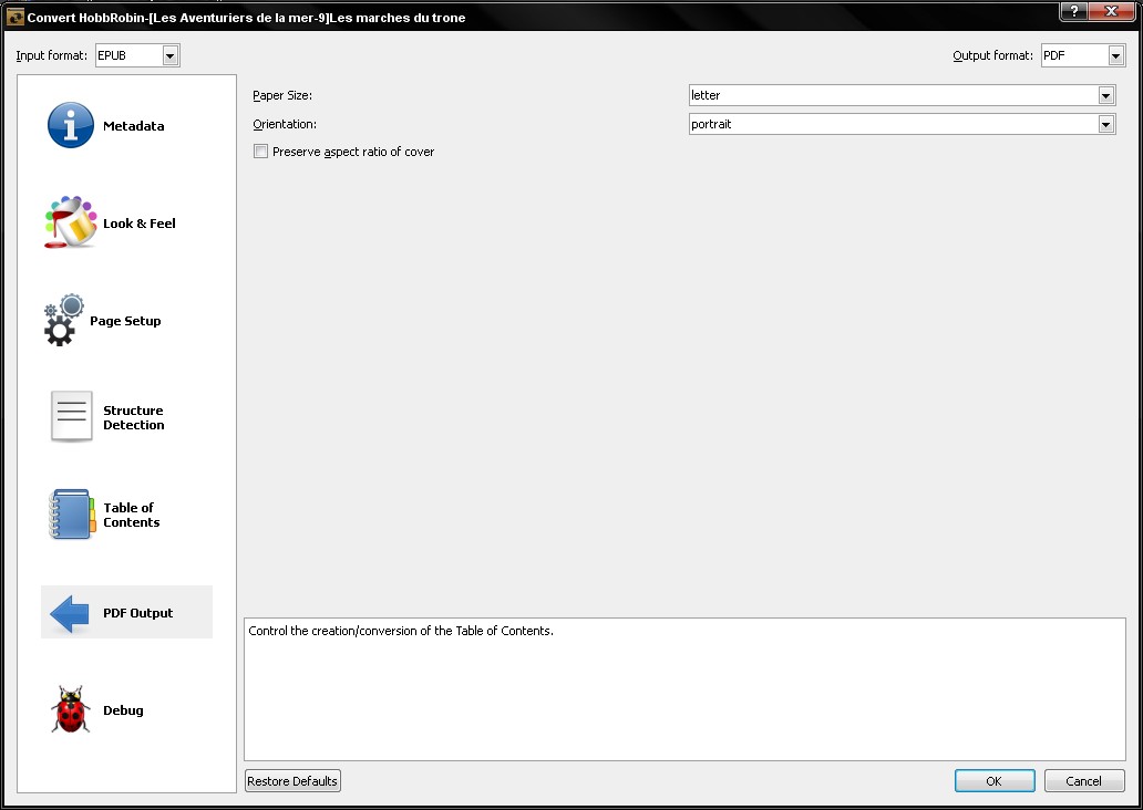I didn't find in the pdf output settings any location where I could specify the page size manually... ok there is a lot of choice like a4, a5, legal, letter etc... but I can't add a paper size. however, I have used the command line and it 's work (but no book cover), it's a little boring because I have to do this manually for each book : "ebook-convert La_premiere_Lecon_du_Sorcier-Goodkind_Terry.epub La_premiere_Lecon_du_Sorcier-Goodkind_Terry.pdf -u millimeter --custom-size 92x148 --font-size-mapping 14" Regards Last edited by yannou75; 01-07-2011 at 08:02 AM. |