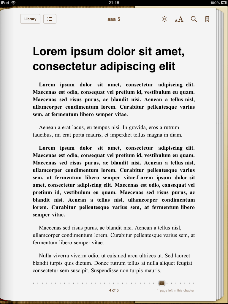 Well, iBooks probably isn't able to justify text. No, it is. When I add simple <b> tag to some paragraphs to make them bold, they appear bold... and justified. Please look at picture attached. There is also HTML code which was used as source for the EPUB in the second picture - just very simple, nothing complicated. What am I missing? Why the basic text has only left alignment and after I add bold, it will justify? Thank you Last edited by marekl; 01-21-2011 at 05:39 PM. |