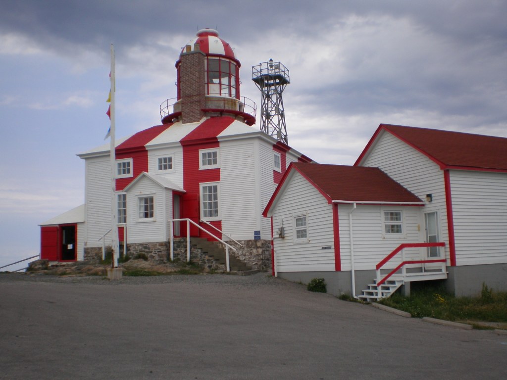 This is the back side of the original lighthouse in its red and white glory, and the ugly steel tower that replaced it. A beautiful place to visit in the north-east corner of Newfoundland, lots of whales, puffins, and icebergs in season.