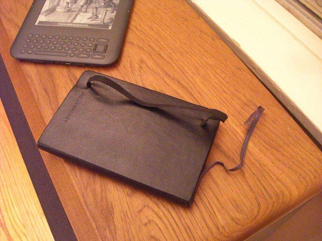 1. Place your Kindle inside the elastic of the Moleskine such that the elastic is only around the Kindle (the backs of the Moleskine and Kindle should be touching) and the binding of the Moleskine is facing down. Rotate the Moleskine to be perpendicular to the Kindle such that the binding is facing away from the Kindle and the edges of the pages are touching the Kindle. If the elastic is taught, continue to the next step. Otherwise tighten the elastic, as described below, before continuing.