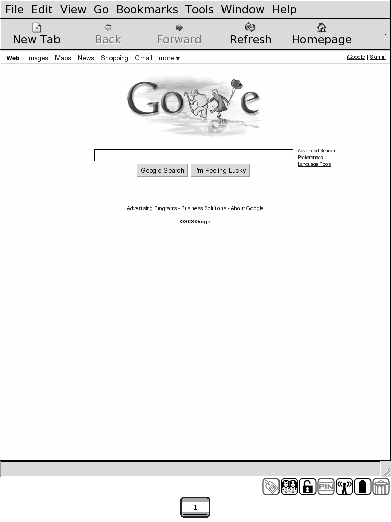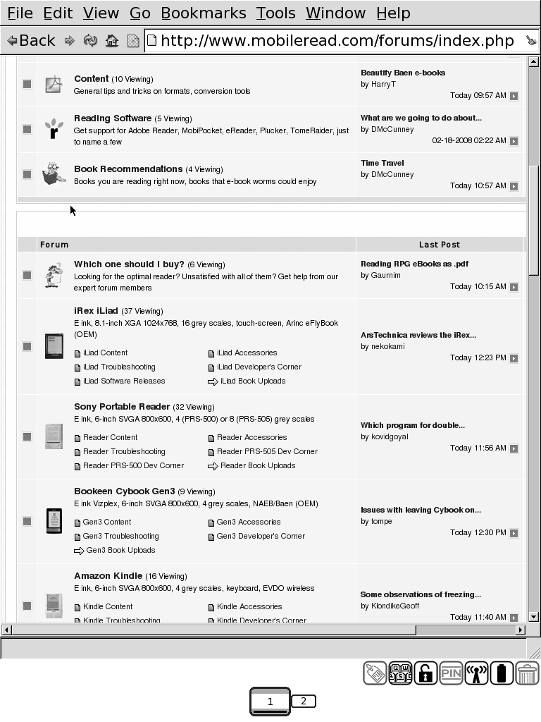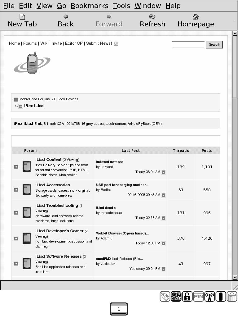 If that list doesn't scare you, go ahead and download it. I think it's the best browser on the iLiad yet. The screen refreshes are all done internally, so they shouldn't be too troublesome. The pagebar and up/down arrow keys work. Most web pages look just fine with it. Check it out and let me know what you think. |