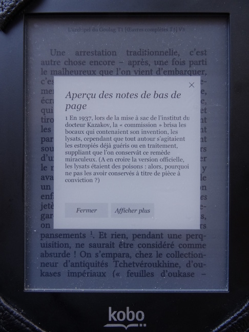 I could experience the huge difference on my Kobo Glo touchscreen (v. 2.8.1. from July 2013) between usual endnotes and pop-up endnotes. It's a life changer, the former ones being an haphazard hit and miss process (when it's recommended to use big note calls, preferably between brackets) and the latter when your ebook reader becomes suddenly very precise and smooth and does not miss any endnote, however small the endnote call can be. The problem and the source of my question is that I can enjoy the display of pop-up endnotes only with .kepub.epub. True the pop-up window could be bigger but this is another question. What I enjoy immensely is the fact that my rate of hit and miss fell down to 0%. The question is: what is the code? I know kepub is a proprietary format and the files kobo.css and kobo.js have not been published. What you find when you open a .kepub.epub is a koboSpan with an id around the link and that's all. So it seems that the kepub renderer engine takes the brunt of it. But I find hard to believe that the code can be shrouded in mystery for such a "normal" thing. I would like to include - say on an external stylesheet - a code for pop-up notes compatible with EPUB2s. Who knows something about it? PS: the screen is indeed dirty...