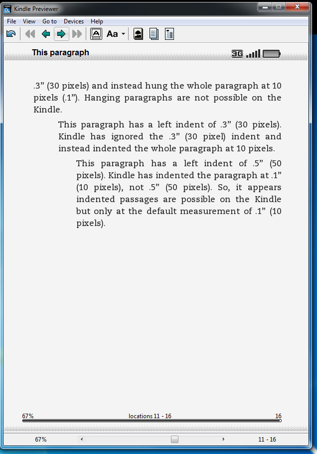 I've been experimenting using Word's Save as Web Page, Filtered for upload to Kindle, but as you all probably know, the Kindle does weird things to formatting -- mainly it doesn't respect one's paragraph formatting much (see first attached file). I have found that converting the HTML file to MOBI in Calibre does respect paragraph formatting when tested in both Kindle for PC and Kindle Previewer (see attached two screen shots). I was elated at first because this seemed like a solution to the problem. But I've been told by a Kindle forum user that: "Calibre ... is not a suitable mobi production tool, as it lacks the proper amount of spacing in the headers to allow all the "Kindle For X" apps to run (as PC, Mac, and iPad apps all require a 2nd layer of encryption)...I wouldn't want author-publishers to go haring off after Calibre like it's the Holy Grail of ebook production only to find out that buyers were returning books because they couldn't be read on anything but the Kindle Device itself." Yet, I had a mobi file, that was created in Calibre, converted into Kindle's azw format and it worked fine on my Kindle for PC. This suggests the guy's information is outdated; but before I suggest to others that it WILL work, I'd like to hear from other users or developers. Thanks, Michelle |