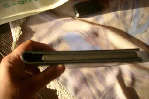 When it arrived, I realised the differences between DR800 and Iliad: less wide, less tall (only a margin below the screen), and the socket on the bottom... But I discovered that the cover came packaged with a hard foam the size of Iliad, to keep its shape. Using a paper cutter, I cut two pieces of it - one about 20X1.2cm for the side, and the other 15.5X3cm for the bottom, with a cut corner for the finger to slide the on-off switch and a notch for the usb cable (proved useless). Here are the pics: