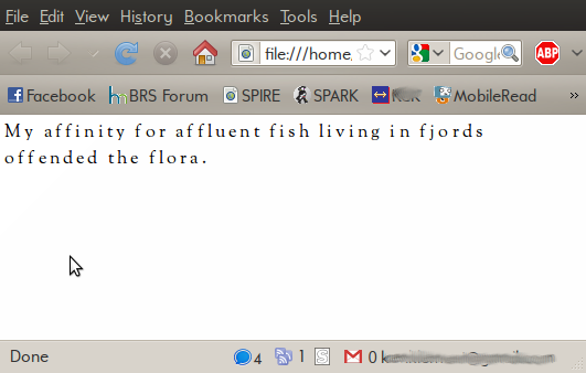 No. Do you mean just to see how it handles the letter-spacing attribute? I mentioned in the opening post that I began with a LaTeX version of the file, and so I already have a PDF version I'm happy with. Newer versions of Firefox do automatic ligature substitution with opentype fonts. I'll check how it handles it, but I'm fairly sure it does it properly, or I'd have noticed by now. |