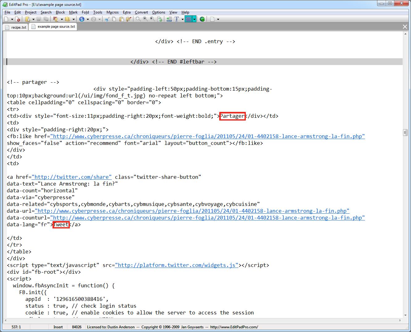 I am trying to edit the "Cyberpresse" recipe (authored by balok and Sujata Raman) to remove the text in the red rectangle which appears at the end of every article: