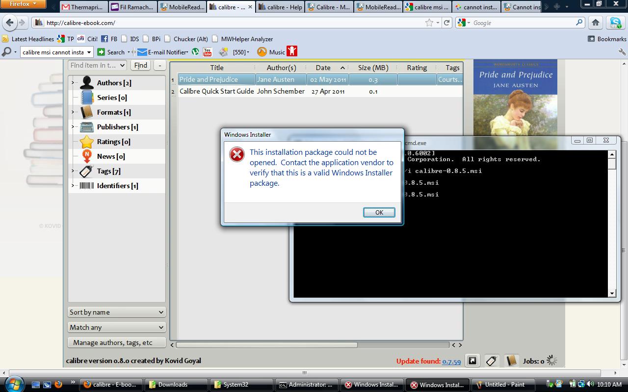 I am the only user for this machine and am listed as the administrator. I've logged off and back on several times, but cannot get Calibre to install. Any help would be appreciated. |
