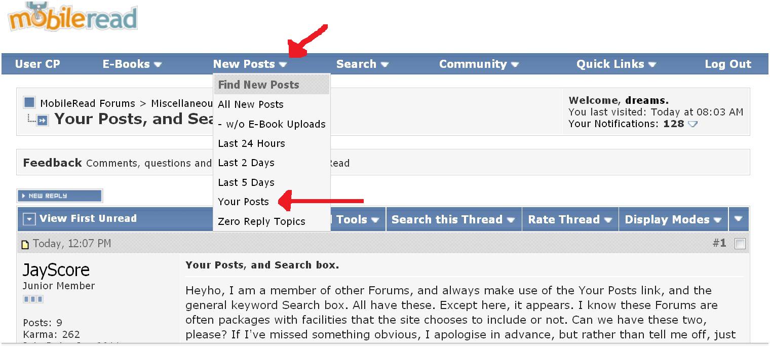 ![]() A quick way for "your posts" also. At the top of the forum page (in the blue bar), just click on "New Posts", and scroll down to "Your Posts". To search - At the top of the forum page (in the blue bar), click on "Search", then scroll down to "Advanced Search". |