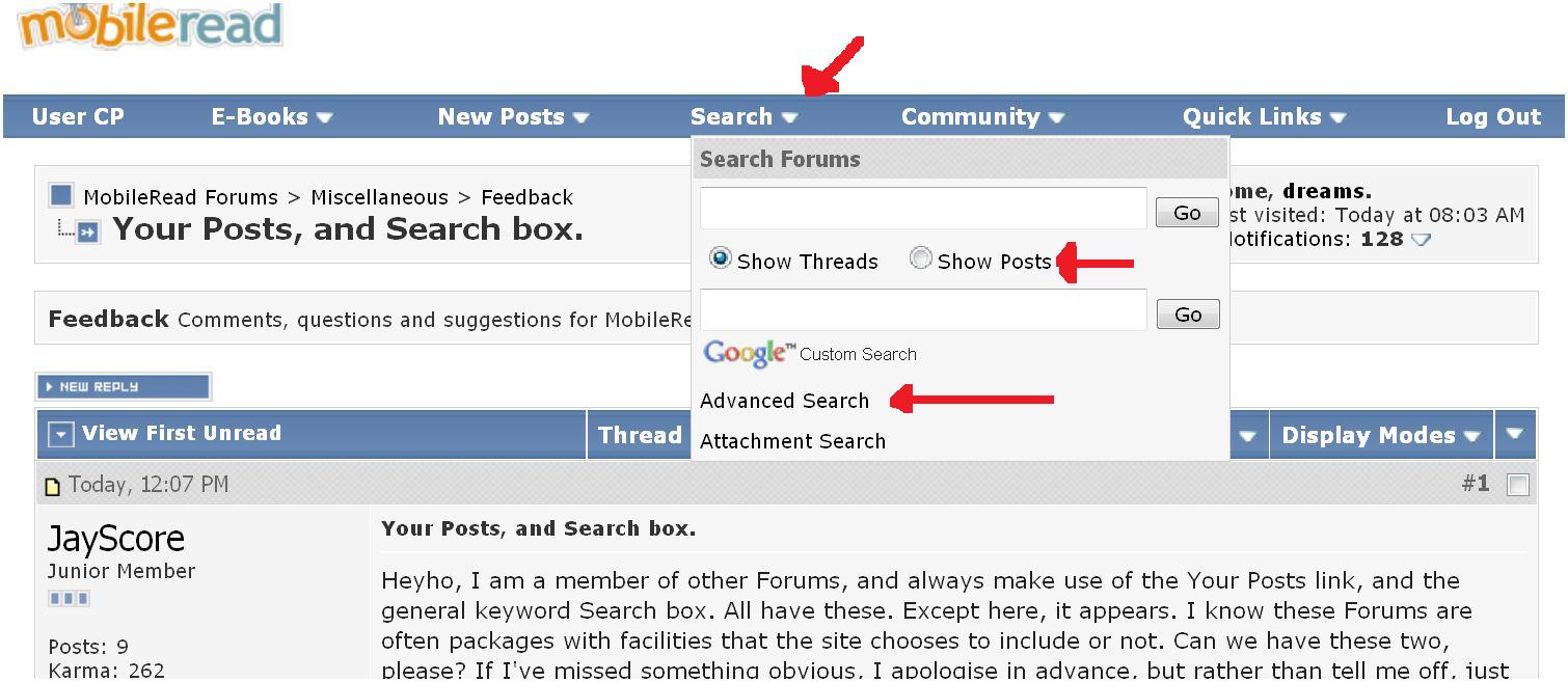 | Problem using 'Advanced Search' with 'Search in Forum' | Wetdogeared | Feedback | 6 | 06-21-2011 10:37 AM |
