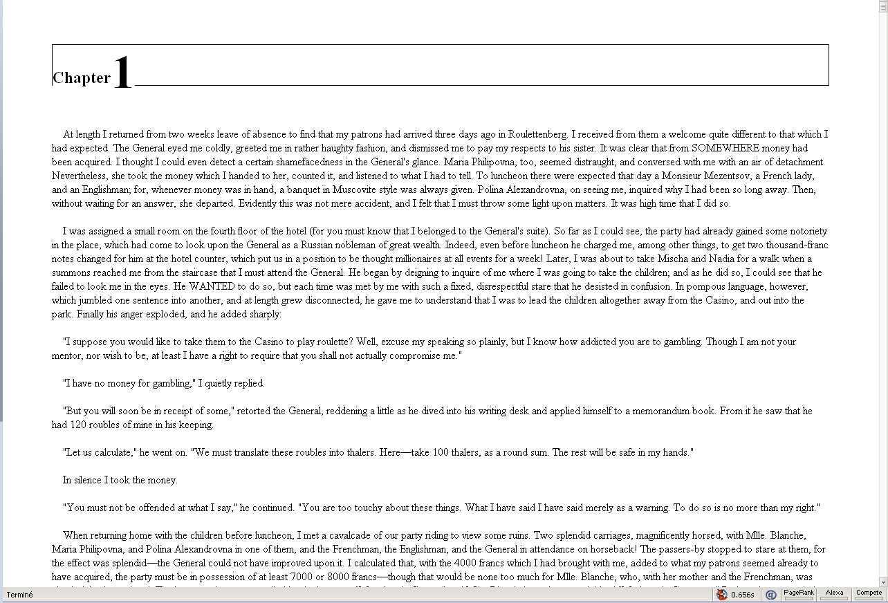 Much much faster than DE. Too bad you don't get a page view, and support for page break instead of a web like view. Here's the screenshot I uploaded on the other thread: https://www.mobileread.com/forums/att...7&d=1190910224 |