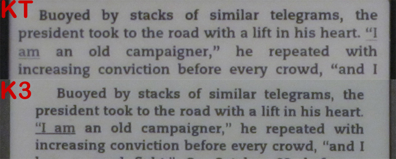 This is the closest I can come to showing a comparison of nearly the same fonts on both readers under the exact same lighting and as close as I could manage to attaining the same font sizes. The two readers are very close in how they render the text. However, I think the Kindle 3 does a better job of rendering the text as it definitely appears a bit darker in real life and it is certainly much more consistent across the screen. That is, the Kobo Touch tends to render text lighter in random areas of the screen than in others. I don't notice that with the Kindle. Though the Kindle 3 currently has the edge with this particular font, I still think the Kobo Touch has potential as text rendering can be enhanced through firmware changes and Kobo seems willing to make improvements. Two caveats about using PMN Caecilia 85 Heavy on the Kobo Touch. One, it is bolded normal text only--no bolded italics. Two, it doesn't render well in kePubs, it only renders as shown in the photos in sideloaded ePubs. Great frustration there as kePubs seem to have lots of issues currently. ... Last edited by jswinden; 07-12-2011 at 01:36 AM. |
