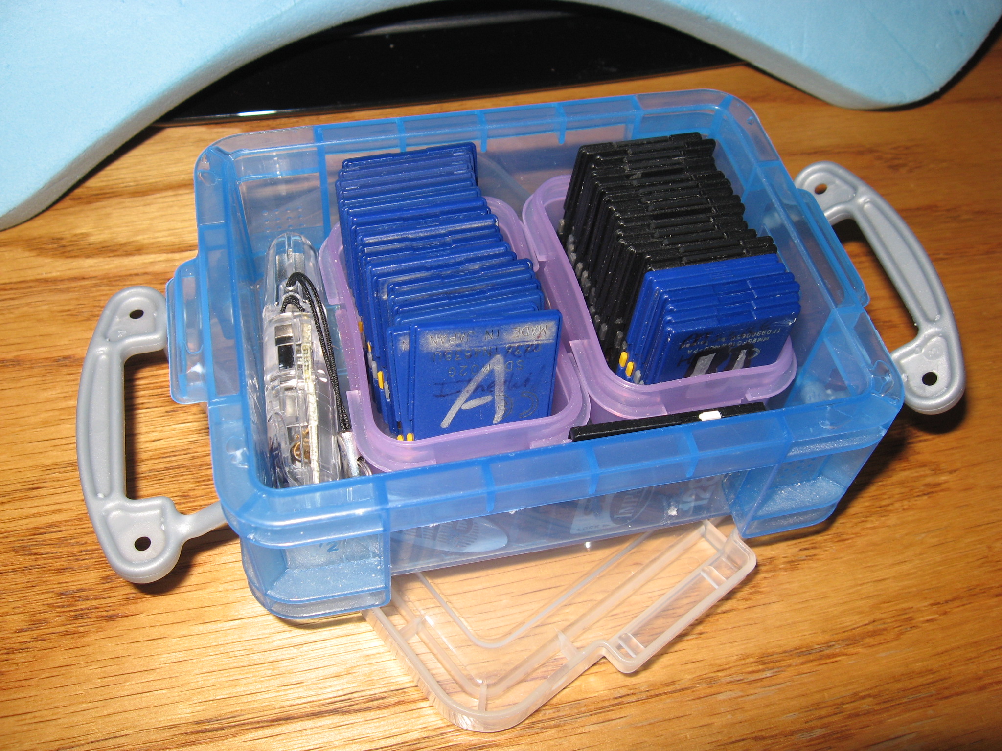 I found a little storage container in sewing supplies which was the perfect width for the sd cards. I line them up into it like a file cabinet. When I overflowed the one container, got a second, filled it up, and they are side by side in one of those small "really useful boxes" (??) that have begun showing up in America. It has a nice lid with side latches, and it is just low enough so that the sd cards will not spill out. Besure to start a labeling system that will expand with you. I started with the alphabet (A, B, C, ...) and soon got to Z. Now the new ones are 1, 2, 3, ... Also, when I insert the sd card into my computer, I change the name on the card to the numbering scheme, i.e., Audio A, Audio B, etc. I also have a directory which has which audio books are on which cards. Hope some of this helps. Last edited by AJ Starr; 07-13-2011 at 11:32 AM. |