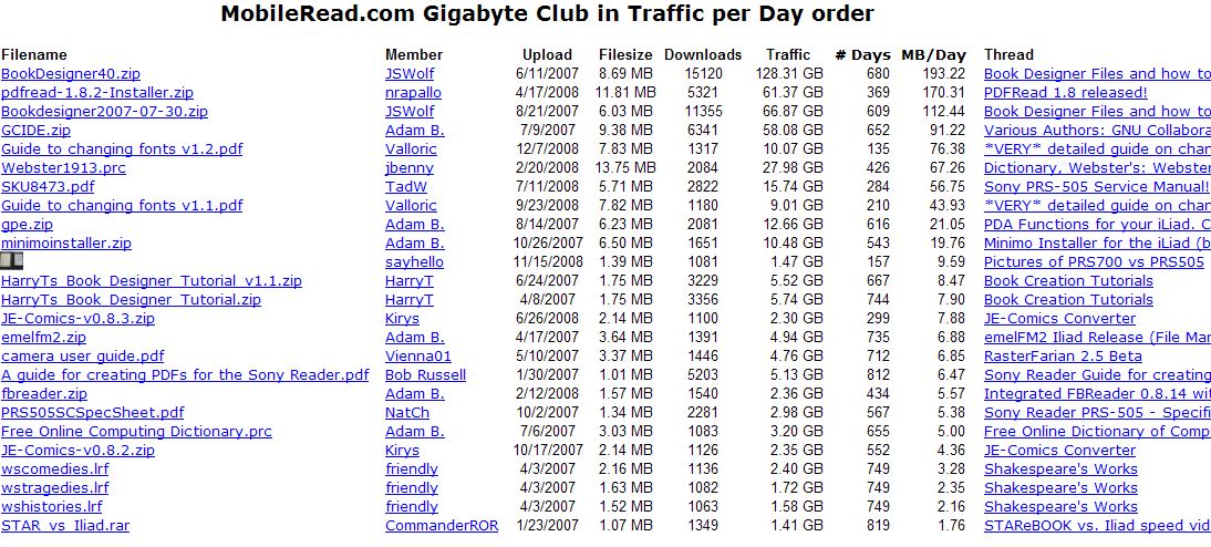 Cumulative these 25 files account for approx. 0.45 TB (Terabyte) in traffic. Shocking to see those traffic/bandwidth results, including my PDFRead installer. Sorry Alex! ![]() I'd hate to see the traffic numbers for the Calibre new release downloads that are hosted on the MobileRead.com servers... ![]() Last edited by nrapallo; 04-22-2009 at 12:51 PM. Reason: added total traffic of just those 25 files |