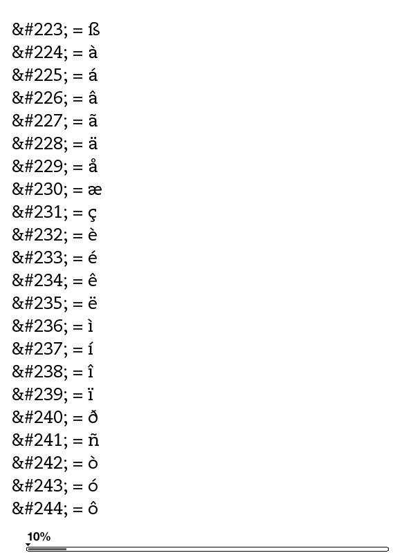 An eBook file/tool to help visualize how each special character displays on a Kindle via &#xxxx;, where xxxx equals a number.