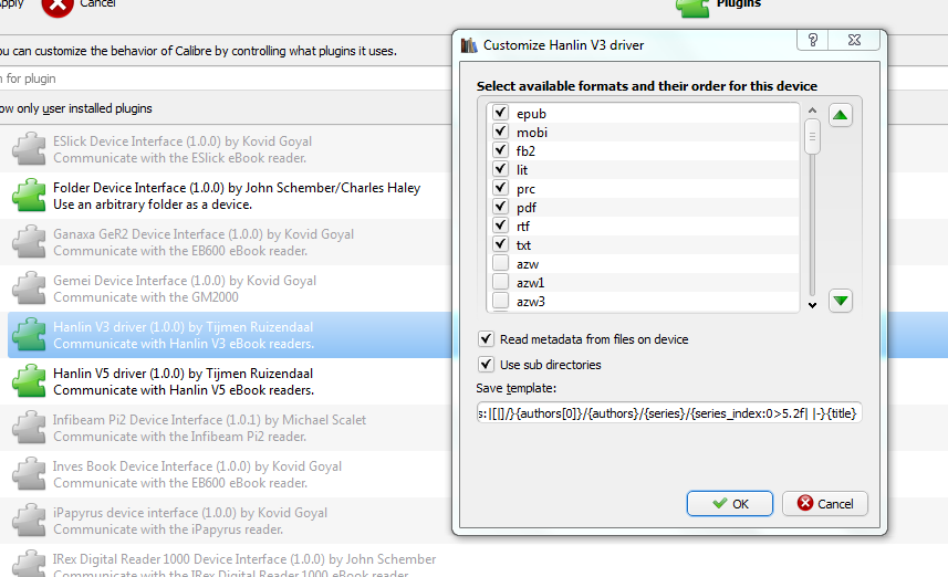 The first template was enterd by clicking the "Device"-icon on the main menu-bar and the selecting "configure this device" and changing the last feel "Save tamplate". The second one was enterd by using the "Preferences"-icon on the main menu and then "Sending books to device" and changing the entry "Save Template". The template I used for the save-to-disk (which works) I entered via the "Preferences"-icon on the main menu and then "Saving books to disk", there I used the {author_sort}/{series}/{title} - {series_index} template. My device is a Hanlin V3 |