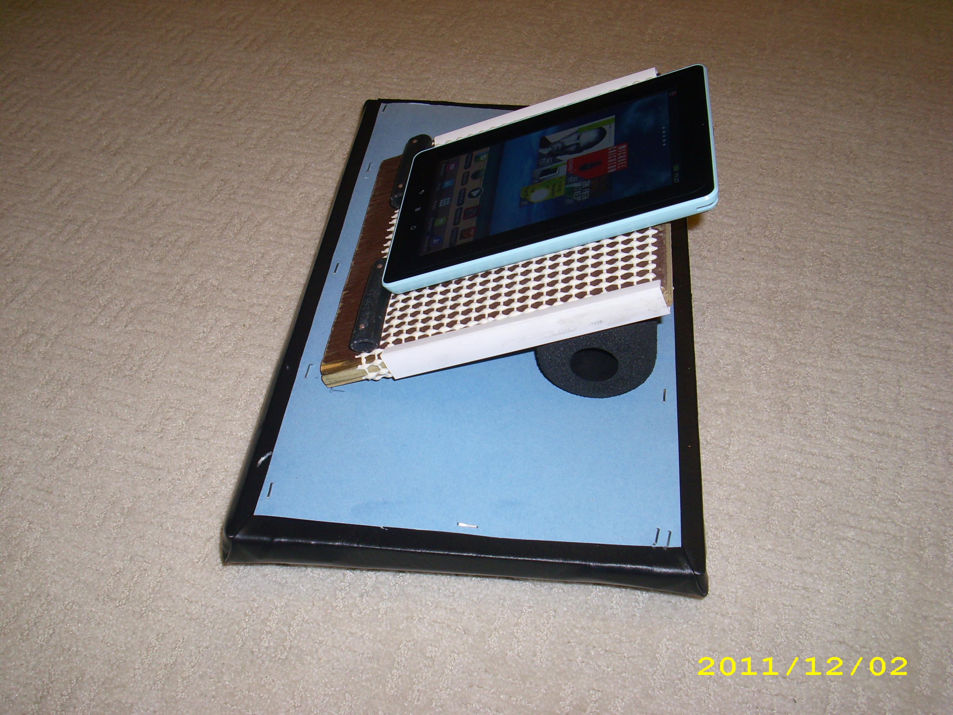 The padded base that rests on your lap is from a weight bench. It's that thing that you rest your chest on and exercise -somehow. I never did figure out how. The Vox holder is a piece of plywood covered with a bit of carpet no-slip (the checkerboard stuff). White shelf edging holds the no-slip in place. With the Vox backing and the no-slip, it's pretty steady and doesn't move around at all. Two pieces of hose (with a gap in between for the charger and earphones) are nailed to the bottom. The rubber hose also keeps the Vox from slipping. The plywood is hinged so that you can vary the angle. The black cylinder that holds it upright also came from the weight bench stuff. It's just foam but it stays in place so that you can easily adjust the angle to suit your needs. Works for me! |