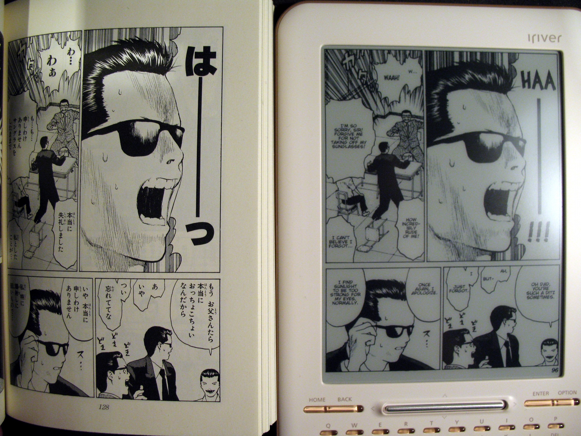 First time I've heard of the iRiver Story HD. With its 1024x768 resolution, it would probably work quite well enough with manga. I think I might get one of those for myself. They're just $100 at Target.