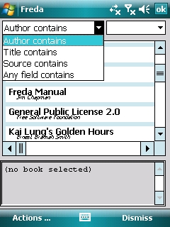 I've written a program for reading eBooks on Windows Mobile devices. It can read txt, html and (DRM-free) ePub files. Screenshots attached. The program is called 'Freda' - short for 'free reader', since it is free software (both in the sense of 'free beer', as I am not charging for it, and in the sense of 'free speech', as I am licensing my code under the GPL). It's in on general release now, so please download it and let me have any feeback. The program uses three third-party libraries, DotNetZipLib, OpenNetCF and the Majestic-12 HTMLParser library; all are licensed on terms permitting their redistribution for commercial and non-commercial purposes. More information is here Happy reading! Last edited by Jim Chapman; 07-11-2010 at 08:17 AM. Reason: new version |