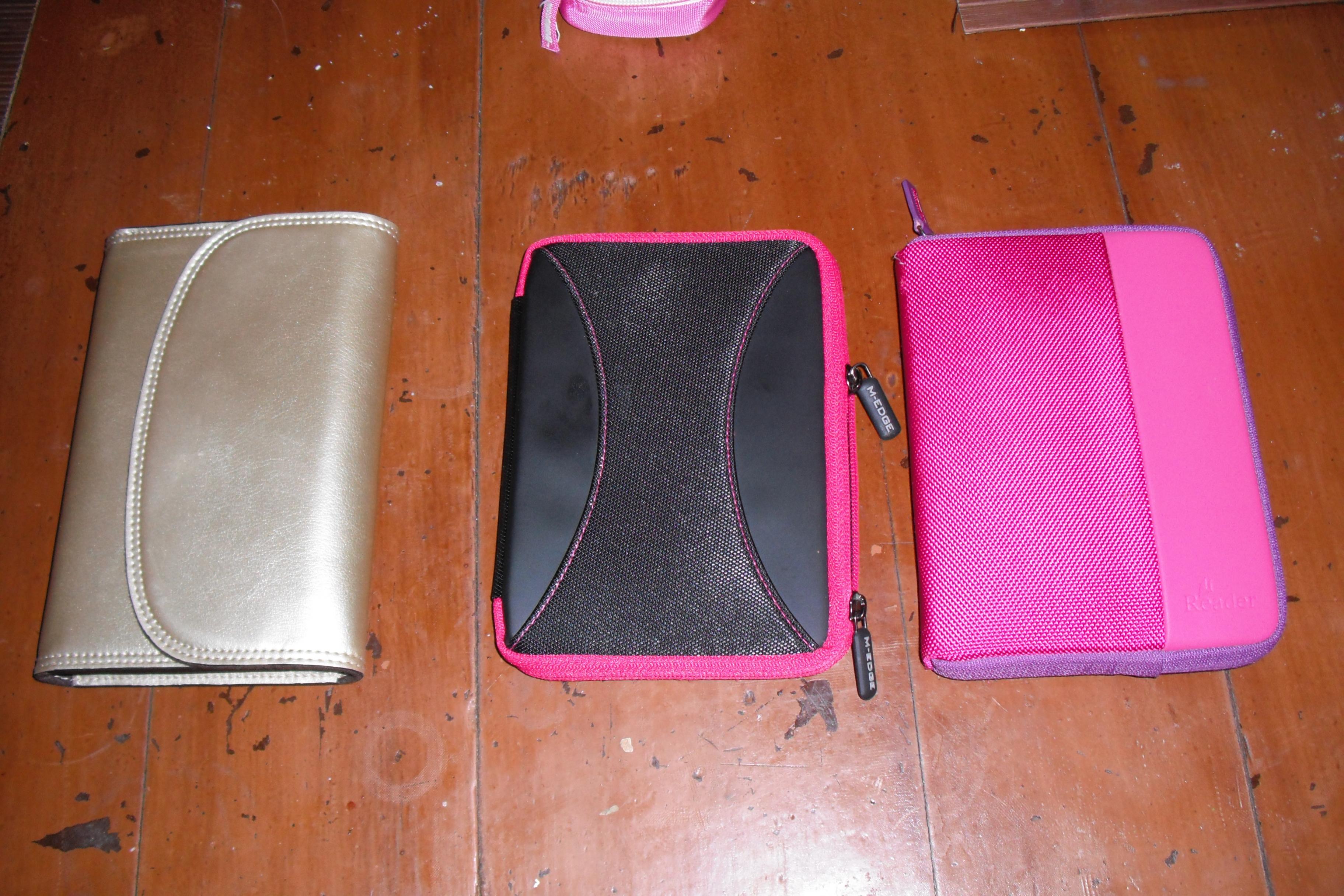 I received a red T1 in the mail from Sony about a week ago. I am enjoying all of the new features - some of which I will use. I'm still going to surf the internet on my 24 inch monitor. I've run into the dictionary thing a couple of times and oddly missing text. I turned the page in the middle of a sentence and the next page was at the beginning of a paragraph??? I reduced the font size and the missing text was there. When I enlarged the font again the text was missing again. Odd The feature that I hadn't heard about and love the most is the setting that lets me choose what font size ALL of my books open in. Until now all books had opened in a tinsy tiny font that I had to immediately change. OK, on to the purpose of this post. I had to find a home for my new baby. Being a nekid reader I was looking for cases, not covers. Here are 3 that I've come up with that all seem to work quite nicely. The M Edge Latitude Jacket for Kobo Touch and Kindle Touch is new $25 from Walmart: Seems to do the trick and notice how nicely the colors match. I will use it for travel because for everyday the little straps are little annoying. The bottom 2 are leatherlike and the top 2 are elastic. The Sony zippered sleeve is the home for my sister's pink 350 but holds the T1 nicely. It's not quite as rigid as the M Edge but seems to do the job. Sony.com currently has this one in blue for $12.99 in the outlet store. The gold Case Logic case was the home for my 600 which is currently being used by a dear friend. It has the magnetic closure and I like it for everyday use. I also found that the stylus slides into the corned and hooks over the edge nicely. Since my gold case is being used elsewhere I had to find a replacement and found it at Amazon for $5.99. I've attached several pictures. I hope this helps if you're looking for a case. |