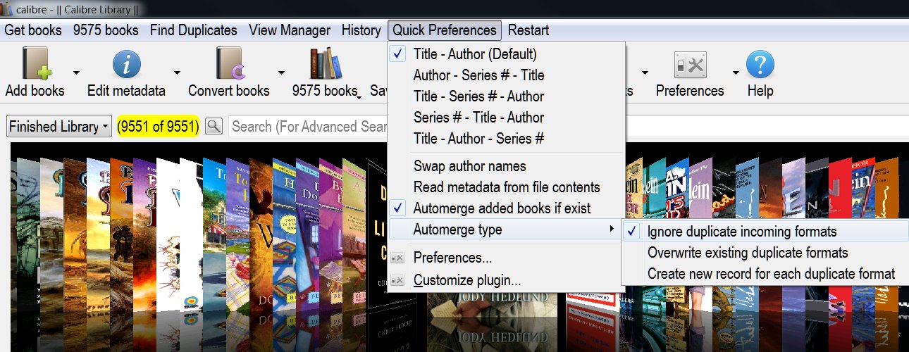 I have my ebook files in mobi & epub inside of Calibre. I needed them in .docx also, so I converted to RTF inside of Calibre, then exported the RTF's and used LibreOffice to convert the rtf's to .docx. What I want to do now is to import those .docx files into calibre in such a way that they will automerge with their epub/mobi/rtf counterpart. That's where I'm running into a problem! I can't seem to get the program to automerge. Here's what I've tried so far: I've used the Adding books Preferences to check Automerge. I've also downloaded the "Find Duplicates" plugin and tried to configure it, but still with no success. Anyone have any ideas on how to make this work??? I know I could manually merge each book, but I have a large library and that would be very time consuming. Last edited by mshnryman; 12-27-2011 at 09:31 PM. Reason: additional information |