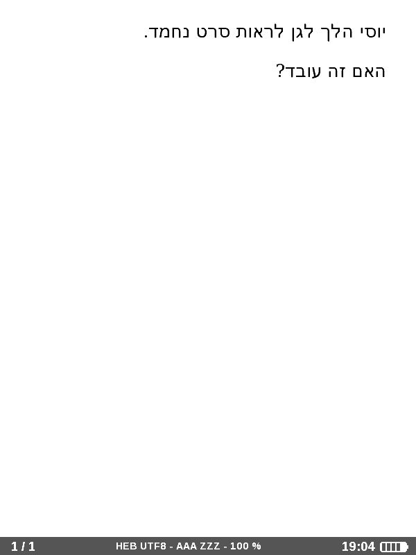 The results were mixed. The epub displays OK (I think) on the PC in the Calibre Viewer. I've attached the epub so you can check for yourself. Unfortunately, once transferred to the T1 the standard epub application displays the Hebrew characters but unfortunately it displays them left-to-right not right-to-left (see attached). Not having any experience of RTL languages I don't know whether there is a trick to getting this to work properly. Alternatively, it's possible that a different Android epub reading app (FBReader or CoolReader) would read the epub correctly. My T1 has not been rooted so I'm afraid I can't check for you |