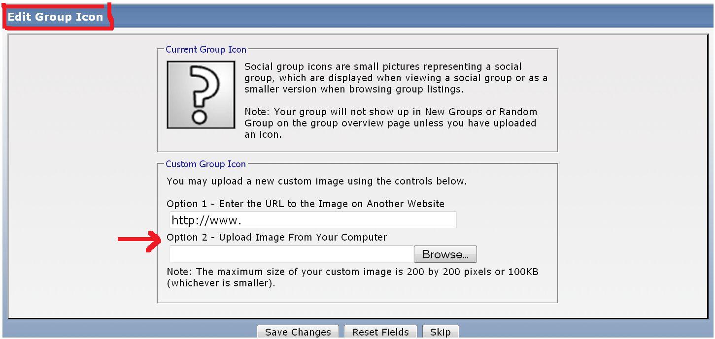 Once in the group you want to add an image, scroll down to the blue bar with options, and click on "EDIT GROUP" Then scroll down down pass that edit box and you will see the "EDIT GROUP ICON" box. From there you can use "Option 2" and "Upload Image From Your Computer ". |