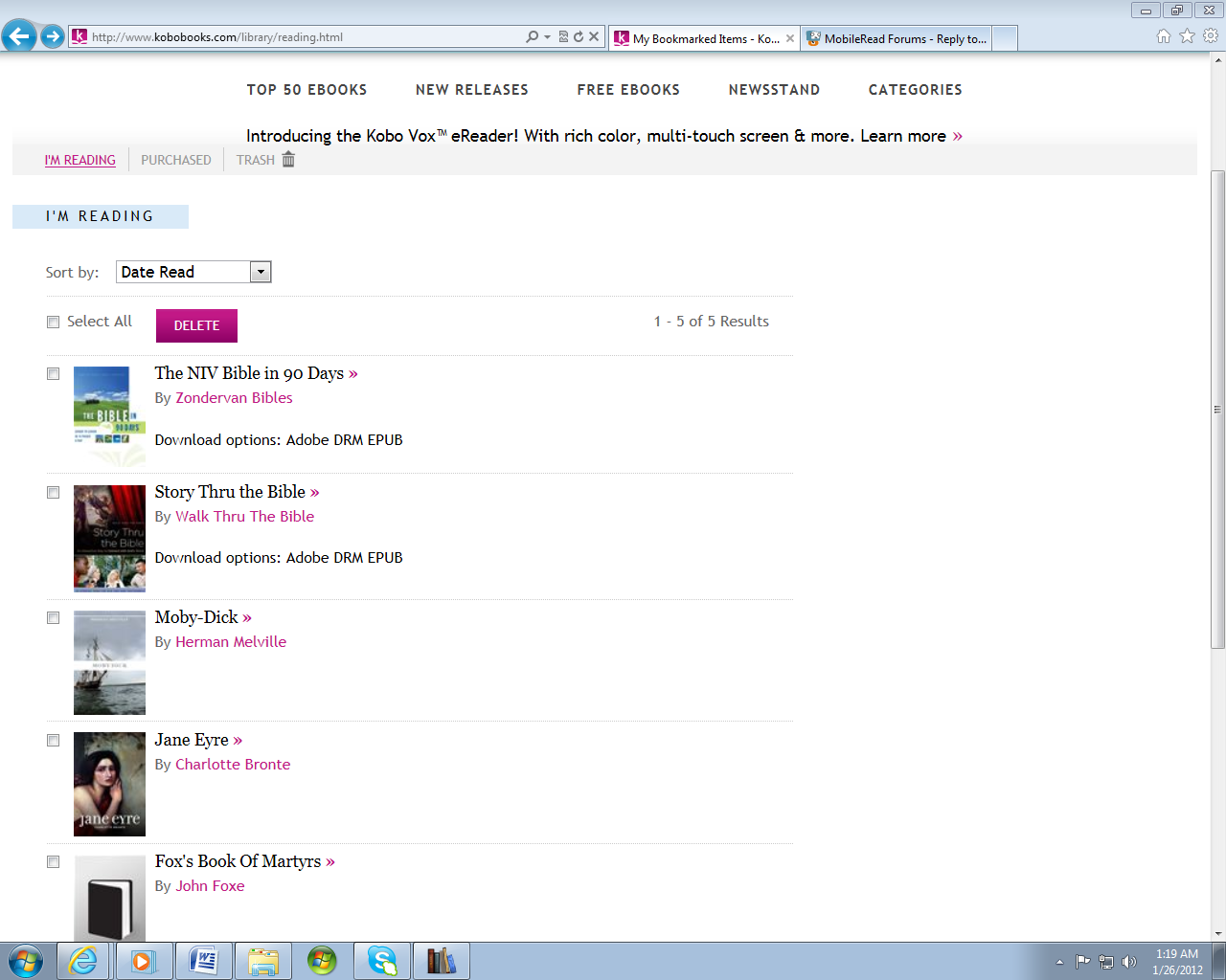I have a Kobo account, I've "purchased" some free ebooks from there and taken some previews as well. They show up in my Kobo library. Yet I cannot seem to find a way to, well, read them. Clicking on a book takes me back to the info page on it. I also have the option to delete a book from my library. I don't see any other options available to me. What am I missing? I'd like to get them into Calibre where I can put them on my PB360+ from there. |